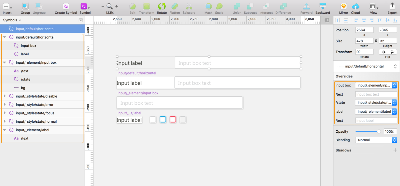 延續(xù)剛剛提到的例子,input/default 由input/_element/input box 與input/_element/label 組成,組成Symbol 后你可以在右邊的Overrides 看到各個(gè)Symbol layer 名稱,名稱太長(zhǎng)就會(huì)以點(diǎn)點(diǎn)點(diǎn)顯示,識(shí)別性低。所以接著要調(diào)整Symbol layer 命名,也就是左邊橘色框框的部分。
