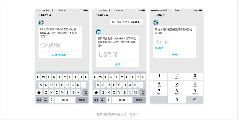 注冊是一個復(fù)雜乏味的交互操作程序,除了一味的下一步再下一步,我們也在思考一些有更多創(chuàng)新點的交互形式。例如我們作為一款社交產(chǎn)品,可借助自身message的形式,讓整個注冊流程像與人交流一樣自然順暢且輕松。這里我們嘗試通過與Baby Q對話來注冊,讓用戶時刻明白自己所處的流程步驟,熟知上下文。同時也會讓注冊產(chǎn)生更多趣味性,并且愿意與Baby Q產(chǎn)生信賴感,提交更多的個人信息。
