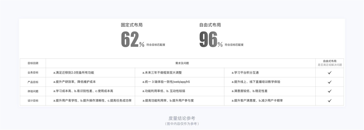 - 最后,我們還需要衡量新框架與目標的匹配度。即使新的框架設(shè)計符合目標,并且可以解決一些可用性測試出來的體驗問題,但我們還需要確保它與目標完全匹配。換句話說,我們需要確保新的框架設(shè)計可以最大程度地滿足我們的目標,并且能夠帶來更好的用戶體驗和產(chǎn)品滿意度。