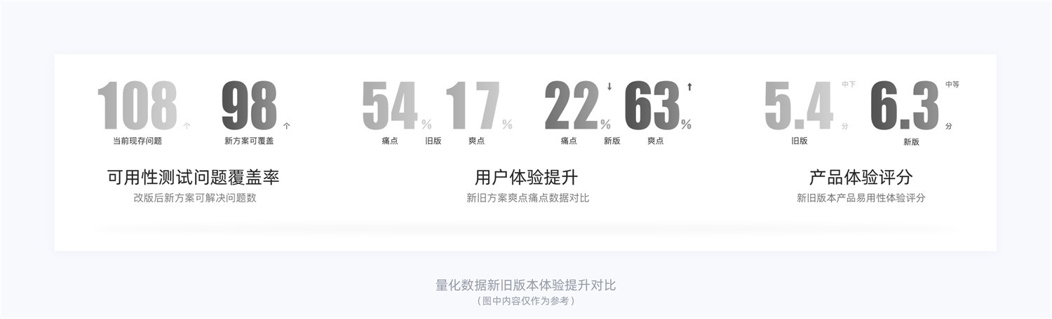 在 MVP 方案驗證結(jié)束后,根據(jù)測試結(jié)果和問題討論的結(jié)果,我們可以通過以下三個維度“可用性測試問題解決覆蓋率、用戶體驗提升比、產(chǎn)品體驗評分”來度量新舊版本產(chǎn)品體驗提升效果,并且和前期洞察產(chǎn)品體驗問題結(jié)論形成閉環(huán),(強調(diào)一下:這里的數(shù)據(jù)不是憑空捏造而是前期我們給自己挖的坑,在執(zhí)行階段時需要我們一點一點填補上前期挖的坑,可以理解為是一環(huán)套一環(huán)的思路哈!數(shù)據(jù)驗證指標可以在前期共同討論設(shè)定的,不僅限于此?。?/p>