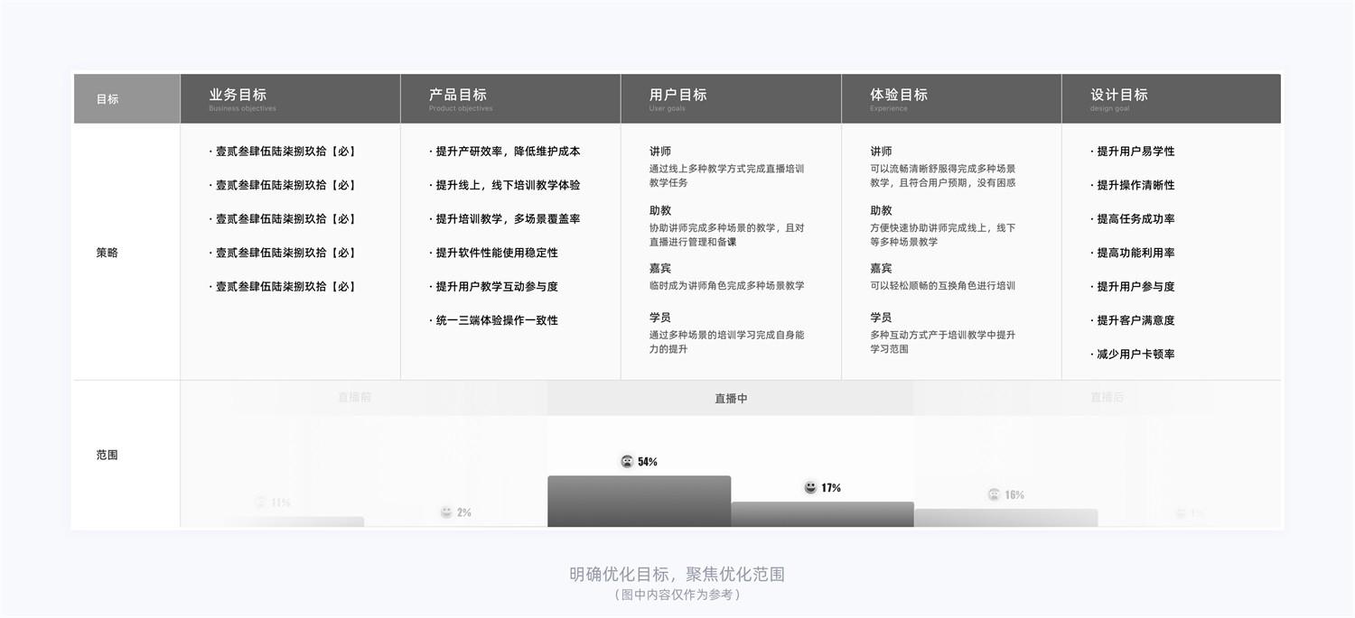 我們通過前期的“體驗層和用戶層”分析結(jié)果提取關(guān)鍵性問題,并與業(yè)務(wù)方共創(chuàng)、分析、量化當前版本中存在的體驗問題,且達成共識共同制定本次產(chǎn)品改版優(yōu)化目標。