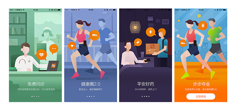 現(xiàn)在幾乎大部分app的啟動頁都會采取插畫的形式,將產(chǎn)品的內(nèi)容、功能、或者是升級的亮點(diǎn)表現(xiàn)出來。人們對于接受陌生事物過程中會產(chǎn)生緊張與不安,引導(dǎo)頁的作用就是短時間內(nèi)讓用戶對這款產(chǎn)品有一個大概的了解,緩解用戶的焦慮與不安,讓用戶更快的進(jìn)入使用環(huán)境。而且人們都是視覺動物,好看的插畫更會獲得用戶本能的好感。所以我們在制作引導(dǎo)頁時應(yīng)該緊扣產(chǎn)品功能的痛點(diǎn),表達(dá)時需要易于理解、符合產(chǎn)品調(diào)性且風(fēng)格統(tǒng)一,可以通過一個個小場景、小故事、或者元素等方向來繪制插畫。