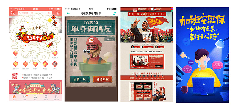 除了一些產(chǎn)品上的功能場景,在一些大的運(yùn)營活動和h5推廣時也是插畫得以大展身手的好機(jī)會。從前兩年淘寶雙十一、元旦等節(jié)日時首頁各種優(yōu)美的插畫特效開始,讓我們發(fā)現(xiàn)原來app還可以這么玩;還有一直火爆到現(xiàn)在的h5,可以發(fā)現(xiàn)大部分都是以插畫為主,只是風(fēng)格各異、各有千秋。優(yōu)美有趣的插畫可以在第一眼就獲取用戶好感,吸引用戶耐心的瀏覽查看活動頁,同時加強(qiáng)活動氛圍及用戶的帶入感,在反思層次引起用戶的共鳴和好感,吸引用戶主動去分享參與。這一類插畫則沒有太多限制,主要看活動需要提現(xiàn)什么樣的氛圍,神秘、喜慶、幽默、炫酷等,圍繞著活動主題創(chuàng)作一段小故事或者場景,使用戶能夠體會到其所傳達(dá)出的情緒進(jìn)而引發(fā)回憶產(chǎn)生共鳴。