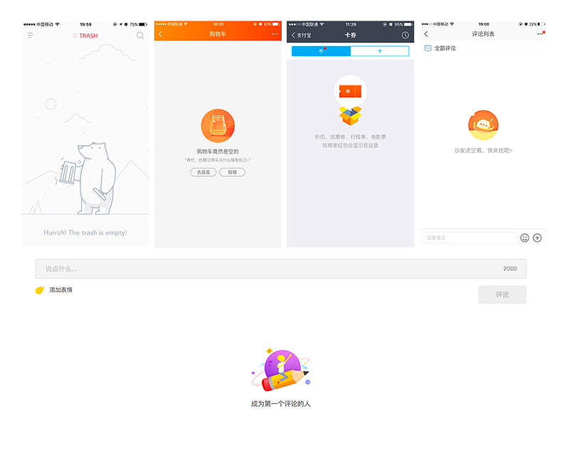 當(dāng)用戶剛剛使用app不久時,肯定會遇到很多還未涉及的功能。可是空空的頁面對于用戶來說過于冷漠及不友好,這時候則需要去引導(dǎo)用戶或者說明狀況。而用戶對于圖片的接受程度明顯高于文字,通過簡單的插畫直接表達(dá)此頁面目前的狀態(tài),或者用戶去使用某項(xiàng)功能,讓用戶易于接受和理解。此類插畫應(yīng)該簡單易懂,與頁面內(nèi)容和文案相對應(yīng),并且不能和app整體風(fēng)格出入太大。話說這次站酷的改版似乎也有一些這類型設(shè)計(jì)~
