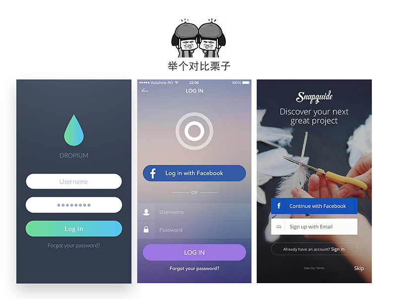 這邊我們可以看到三個登錄頁在本能層次都很漂亮,可是行為層次上,圖1則考慮的比較少,圖二圖三都加入了第三方登錄及注冊等功能,體驗(yàn)更好;而圖三更是加入了“skip”以及一張高清的背景圖片,而這正是在反思層次所做的決定,考慮到用戶是否可以先瀏覽產(chǎn)品再決定是否注冊,已經(jīng)一張優(yōu)美的背景圖和slogan相結(jié)合給用戶描述一個簡單美麗的小場景,引起情感共鳴。