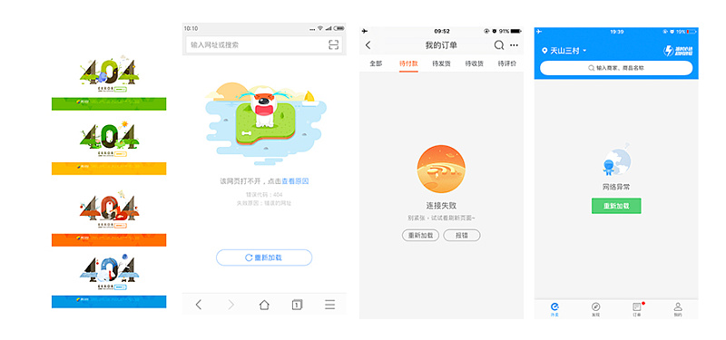 即使我們以產(chǎn)品體驗(yàn)毫無bug,但是實(shí)際的使用中依然會遇到一些無法預(yù)測的情況打斷用戶,例如斷網(wǎng)、404等。這時候插畫就體現(xiàn)了其特有的作用了,減少用戶的挫敗感,擬人化我們的app,使其更具有人情味。此處使用的插圖與“空態(tài)”的要求一樣,簡單易懂為首要前提,同時提高其可觀賞性和趣味性。如果產(chǎn)品有吉祥物,那圍繞著吉祥物來設(shè)計(jì),既能減少用戶負(fù)面情緒,也能不斷的增強(qiáng)品牌在用戶心中的形象。