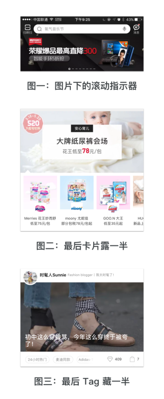 但不管怎么樣,必須要有明顯的標(biāo)志告訴用戶下面的內(nèi)容是可以左右滑動(dòng)的。尤其,當(dāng)你的用戶受眾面非常廣(普通電商、新聞閱讀等)時(shí),年齡較大的小白用戶未必像設(shè)計(jì)師和產(chǎn)品經(jīng)理們對“左右橫滑”的交互這么熟悉,這也會(huì)間接導(dǎo)致這種方式的效率下降。