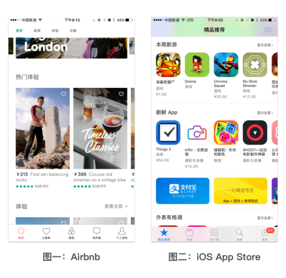 以最新版的 Airbnb 為例,它將首頁分割為 Banner、熱門體驗(yàn)、體驗(yàn)、房源、旅游目的地精選等多個(gè)維度,每個(gè)維度單獨(dú)占據(jù)一整行,并展現(xiàn)并列的內(nèi)容。再看 iOS App Store,也是將頁面分為諸多維度,把不同的應(yīng)用分類呈現(xiàn)。