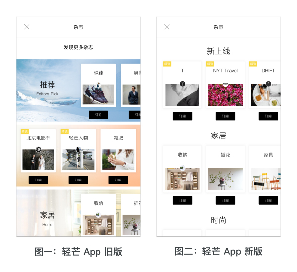 最近還常見到比較夸張的做法,是直接在泳道最左端給一個(gè)強(qiáng)內(nèi)容氛圍。以下圖左側(cè)的輕芒閱讀 App 舊版頁面為例,圖片+文字氛圍的做法雖然極大強(qiáng)調(diào)了主題,但卻也極大浪費(fèi)了展現(xiàn)效率,違背了內(nèi)容優(yōu)先的原則,效果并不好。