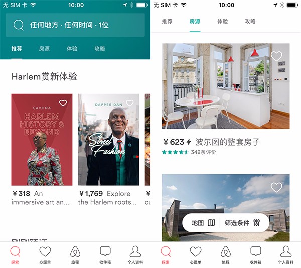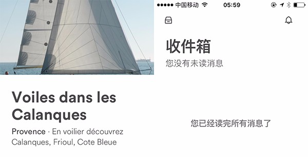 Airbnb是極佳的范例,它采用了一種既不是列表設(shè)計也不是卡片設(shè)計的極簡設(shè)計,大標(biāo)題文本包含一組帶有圖片和描述的元素,組元素和組元素之間保持較大的間距,既保證了它們互不干擾,又不會令界面看上去顯得松散,因而帶給用戶非常輕松的瀏覽體驗。