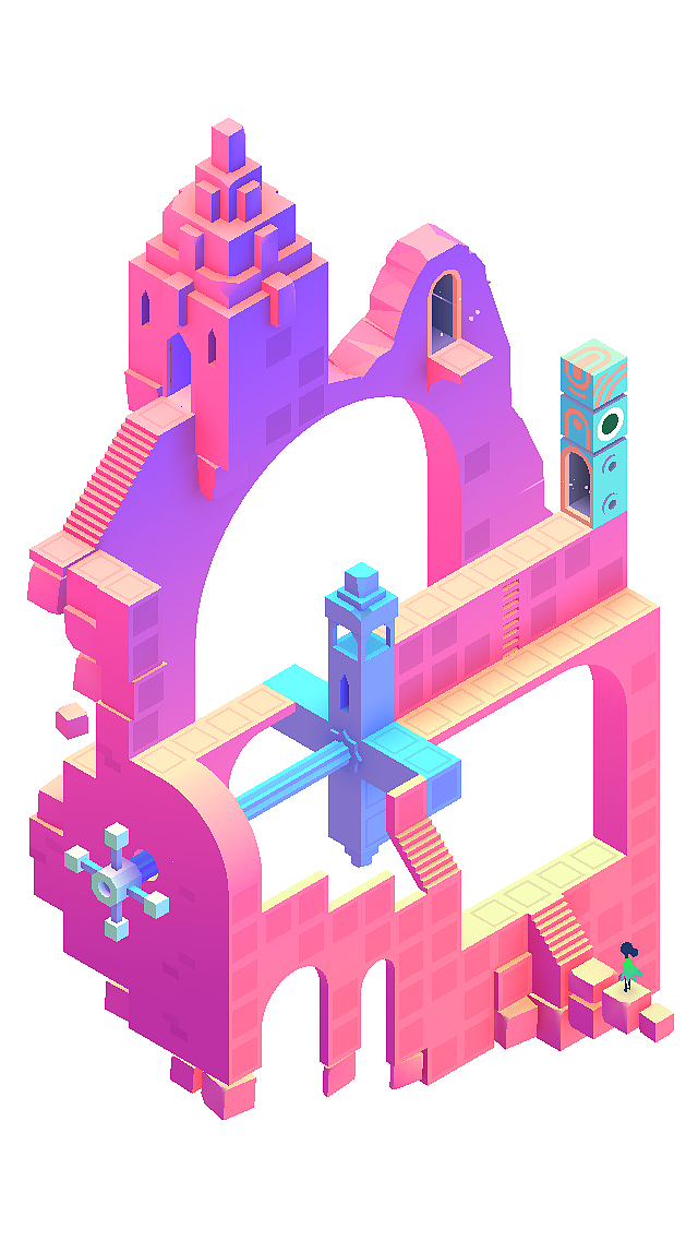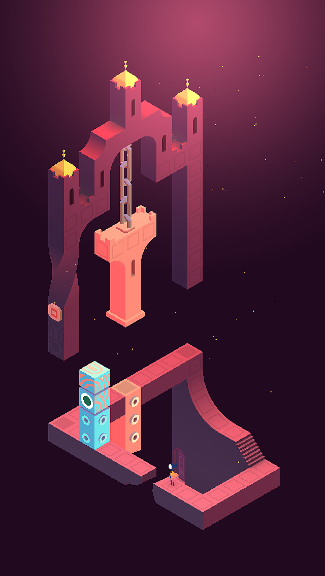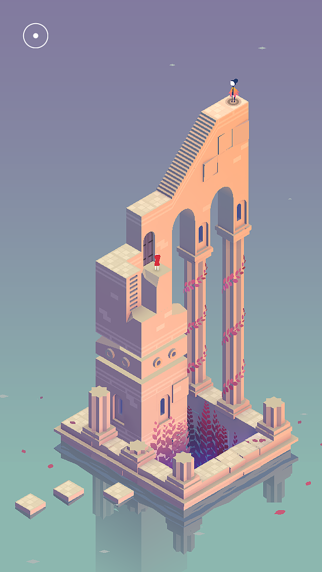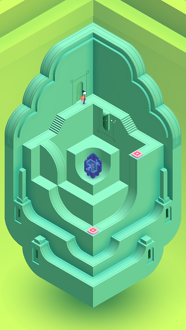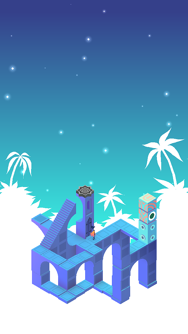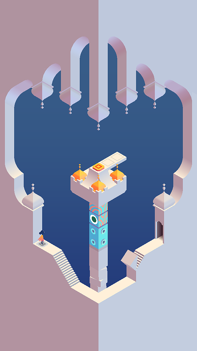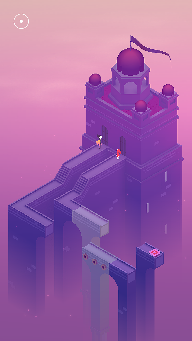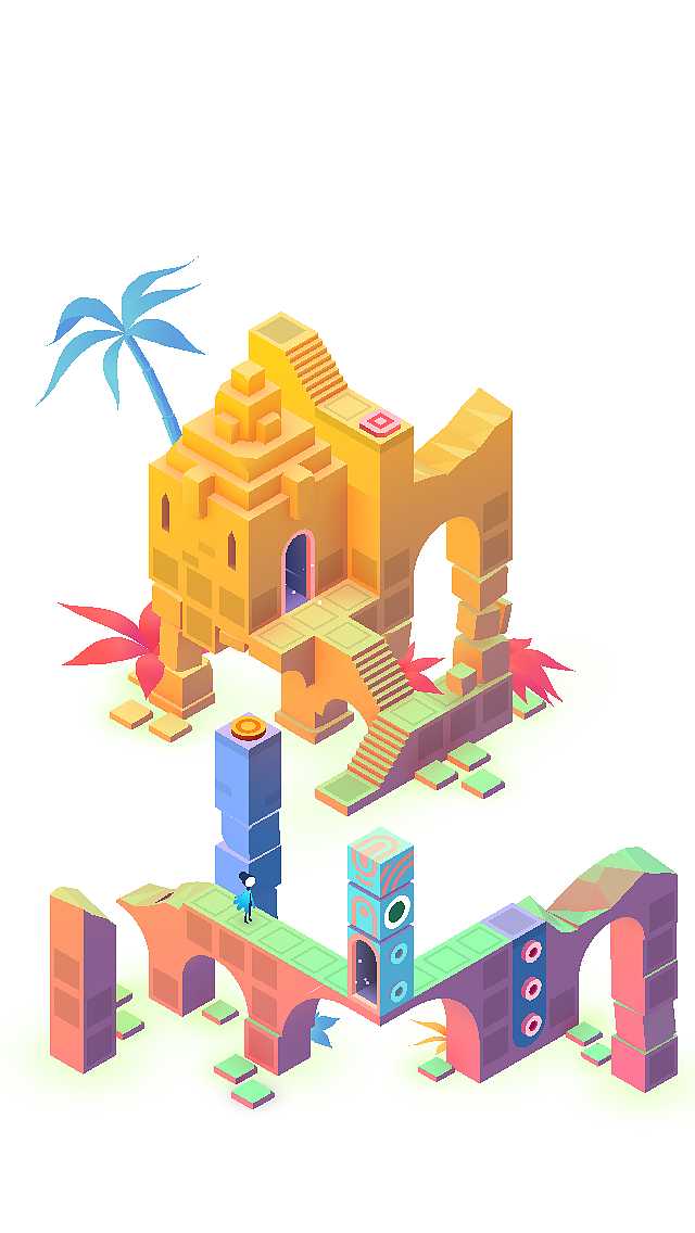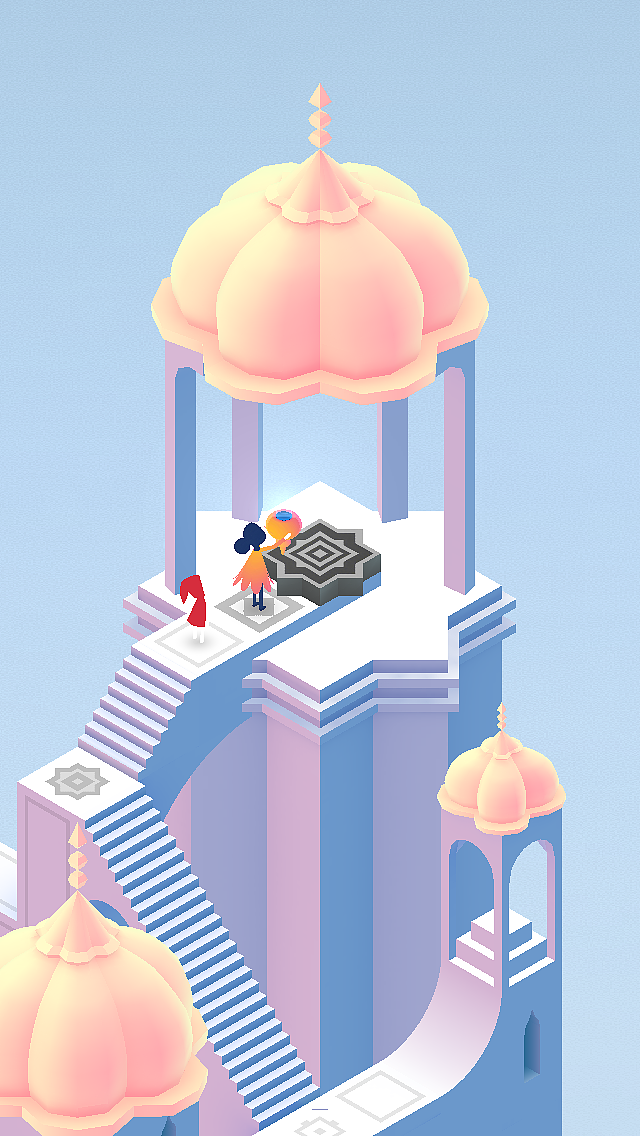 《紀(jì)念碑谷2》在視覺上不僅延續(xù)了前作經(jīng)典的視覺錯(cuò)位藝術(shù),如:“潘洛斯三角”、“凹凸錯(cuò)覺”、“二維三維的扭轉(zhuǎn)變換”,還增添了“德羅斯特效應(yīng)”等幾何美學(xué)元素,搭配了更加清新夢幻的畫面色系。