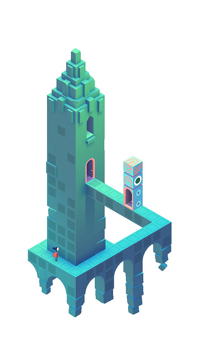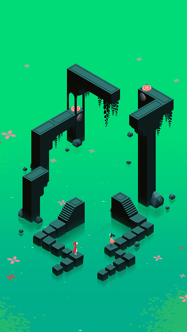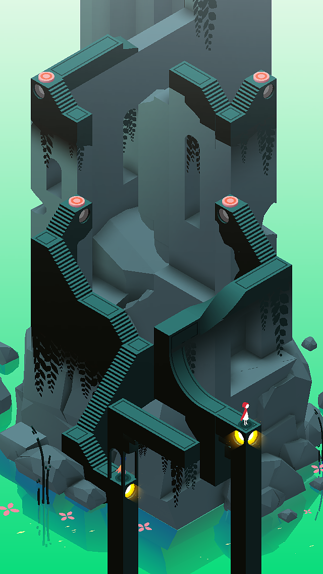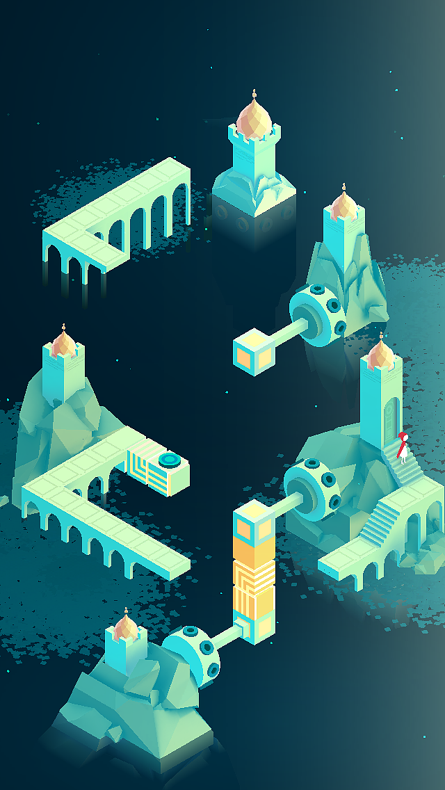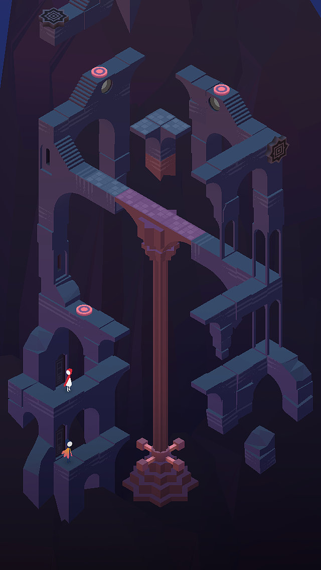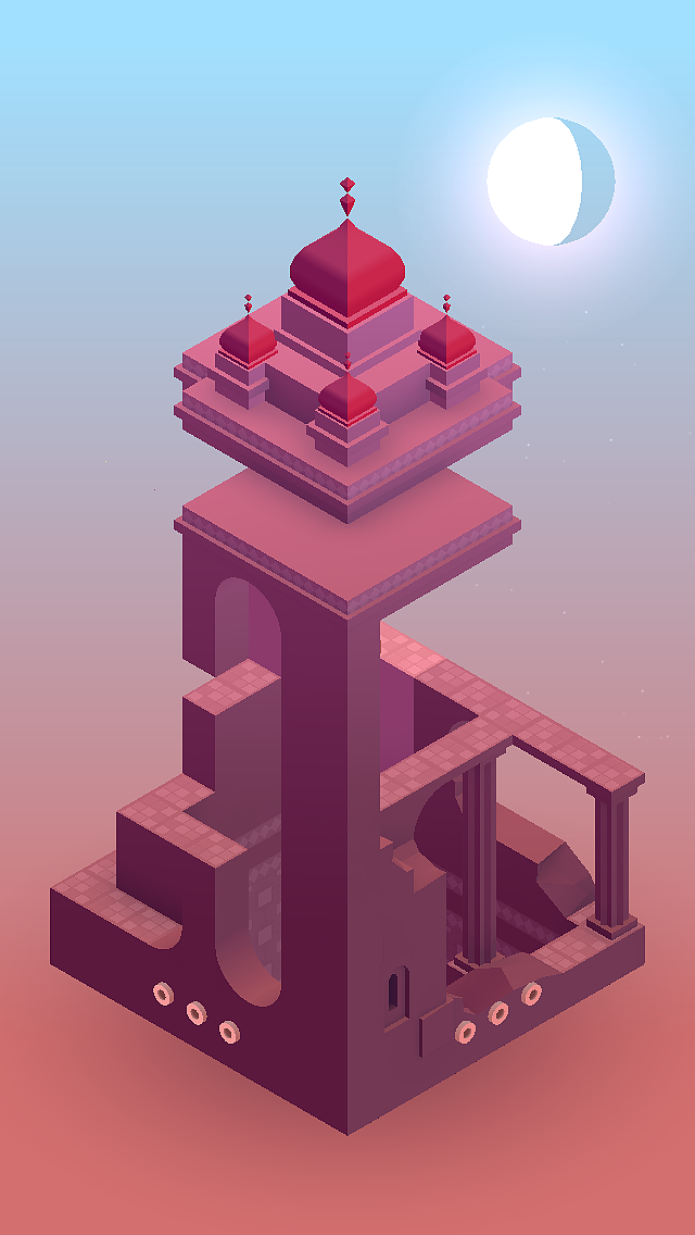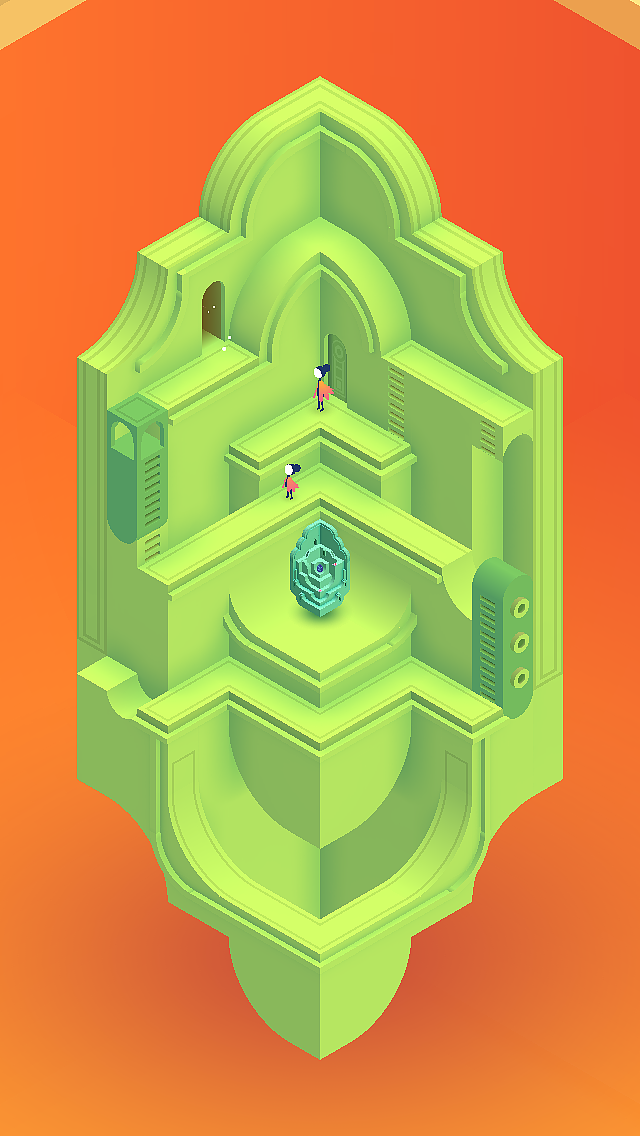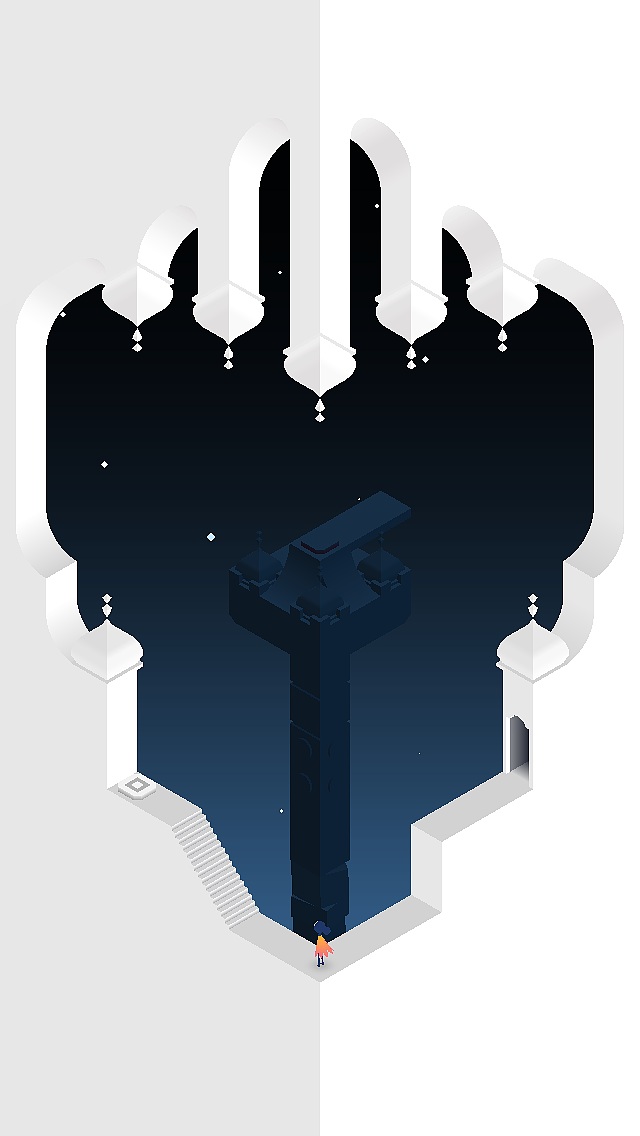 《紀(jì)念碑谷2》在視覺上不僅延續(xù)了前作經(jīng)典的視覺錯(cuò)位藝術(shù),如:“潘洛斯三角”、“凹凸錯(cuò)覺”、“二維三維的扭轉(zhuǎn)變換”,還增添了“德羅斯特效應(yīng)”等幾何美學(xué)元素,搭配了更加清新夢幻的畫面色系。