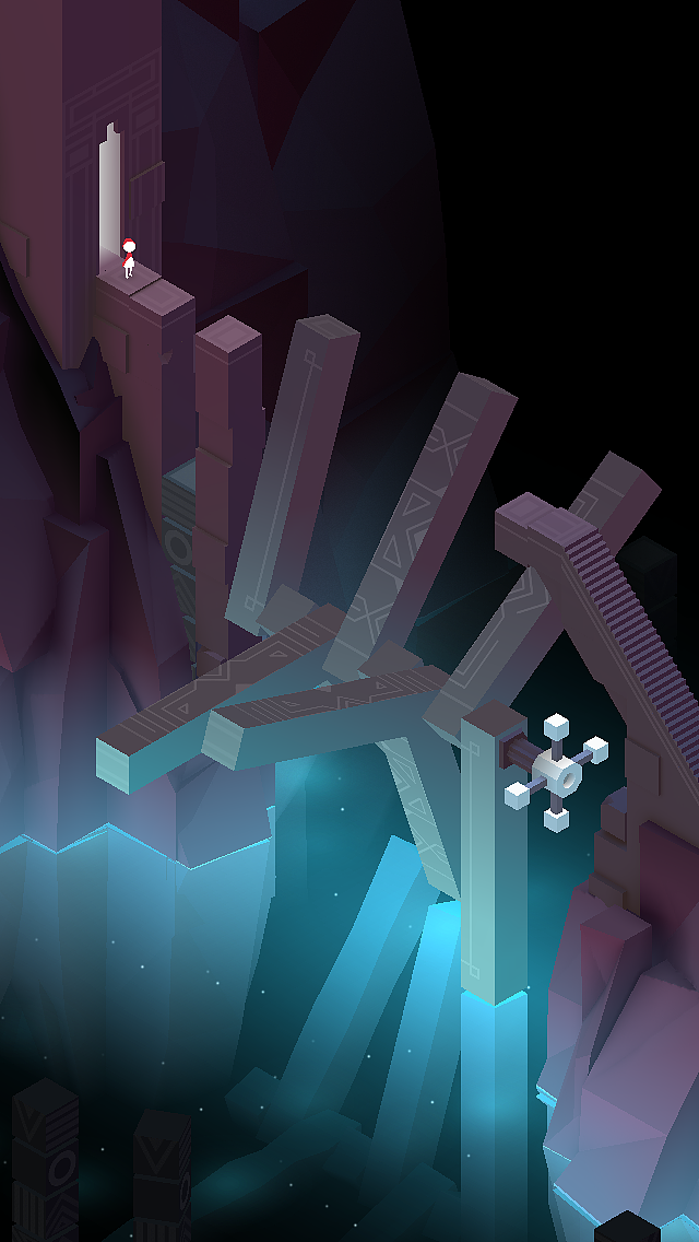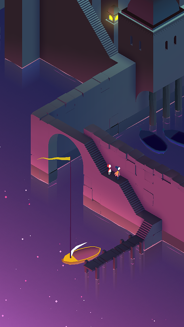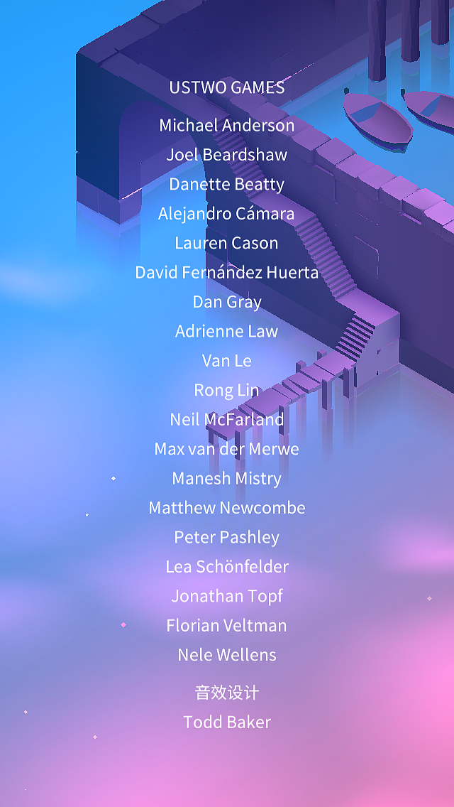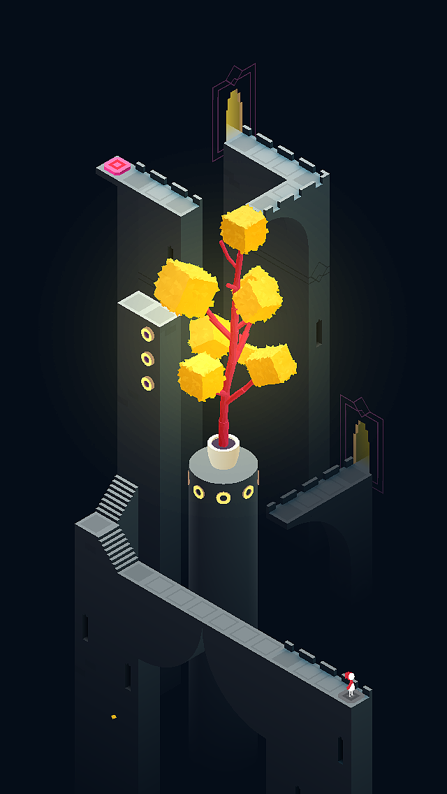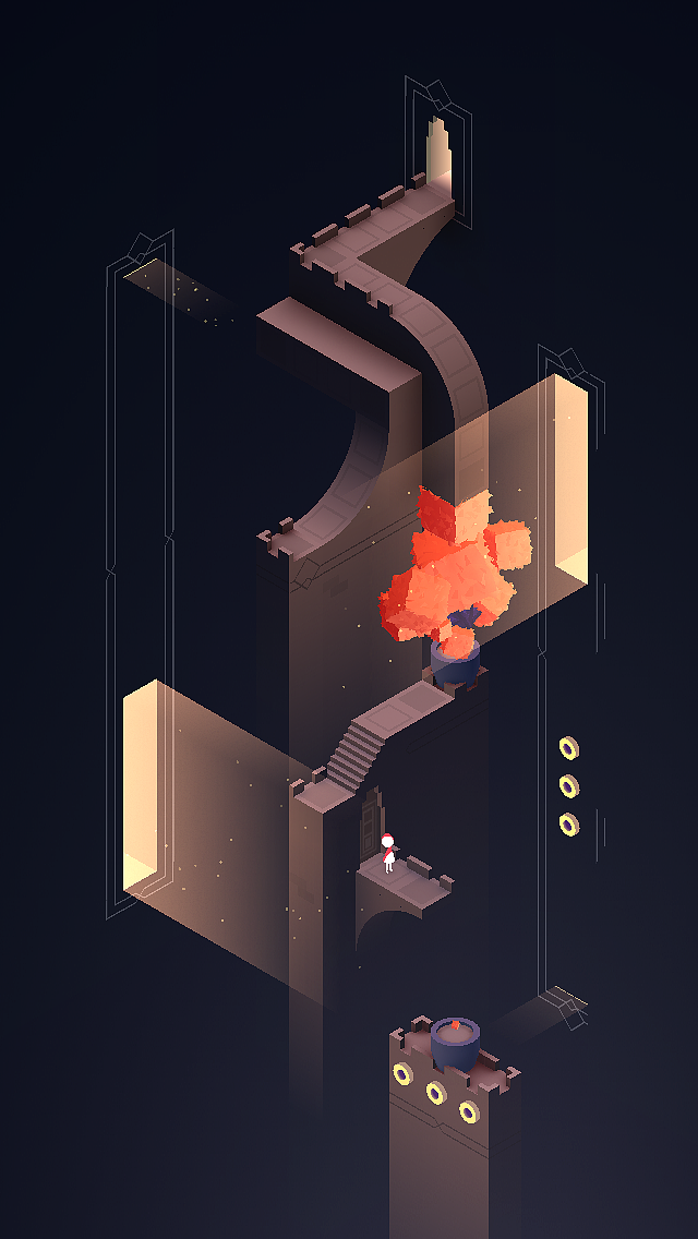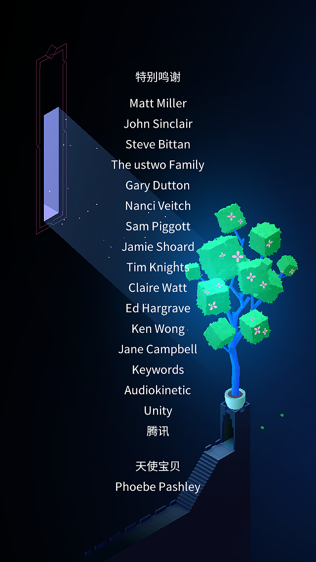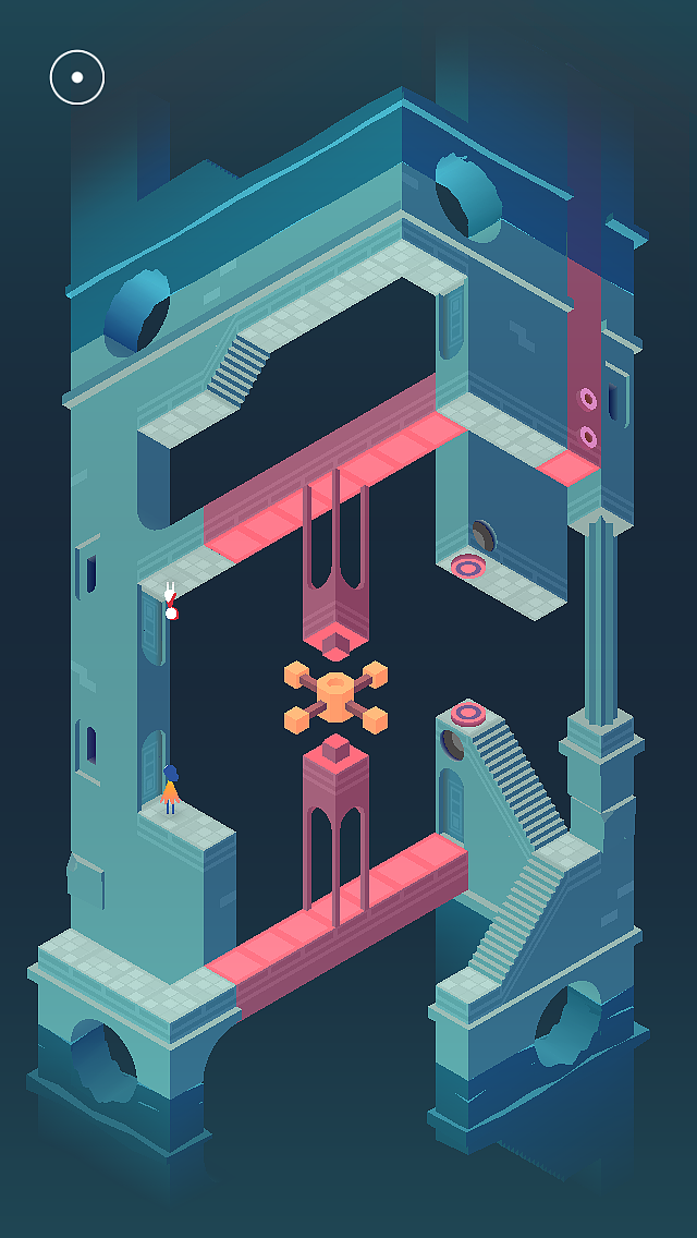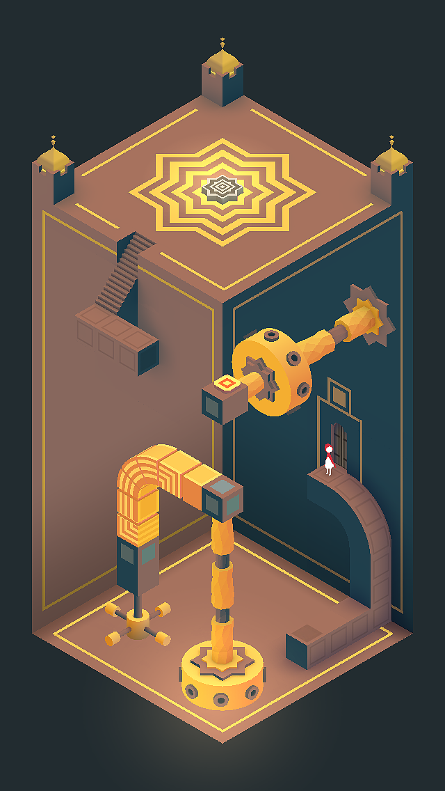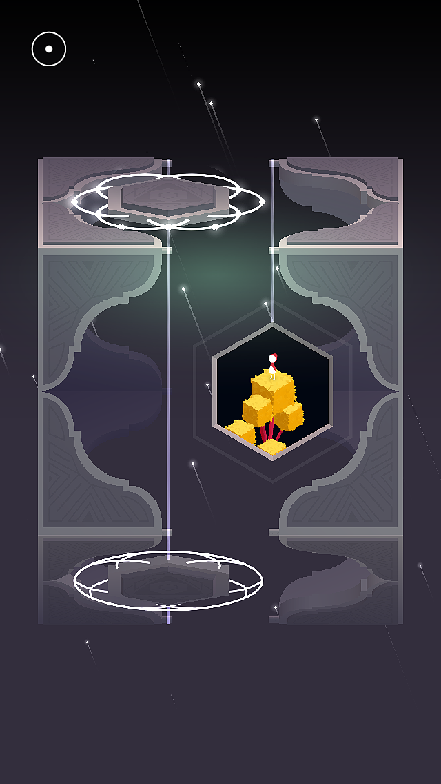 《紀(jì)念碑谷2》在視覺上不僅延續(xù)了前作經(jīng)典的視覺錯(cuò)位藝術(shù),如:“潘洛斯三角”、“凹凸錯(cuò)覺”、“二維三維的扭轉(zhuǎn)變換”,還增添了“德羅斯特效應(yīng)”等幾何美學(xué)元素,搭配了更加清新夢幻的畫面色系。