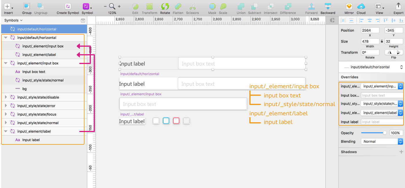延續(xù)剛剛提到的例子,input/default 由input/_element/input box 與input/_element/label 組成,組成Symbol 后你可以在右邊的Overrides 看到各個(gè)Symbol layer 名稱,名稱太長(zhǎng)就會(huì)以點(diǎn)點(diǎn)點(diǎn)顯示,識(shí)別性低。所以接著要調(diào)整Symbol layer 命名,也就是左邊橘色框框的部分。