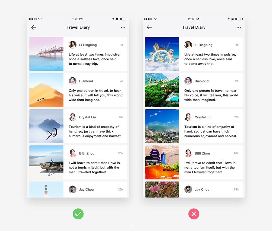 經(jīng)??吹揭恍┰O(shè)計(jì)稿整個界面都是一樣的配圖,胡亂輸入的文案,看起來顯得非常的不專業(yè)。為了降低視覺落地的差值,我們在設(shè)計(jì)的時候盡量運(yùn)用真實(shí)有效的信息去填充我們的設(shè)計(jì)稿,在提案的時候才能給決策者一個還原真實(shí)場景的有效方案。