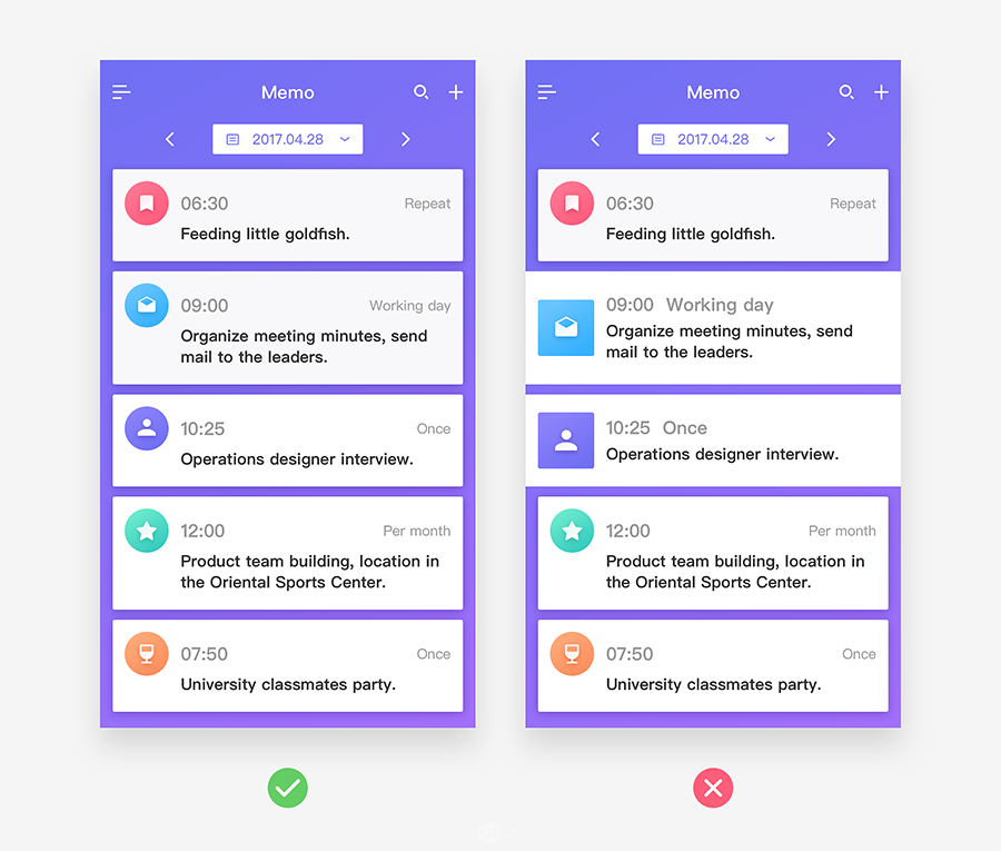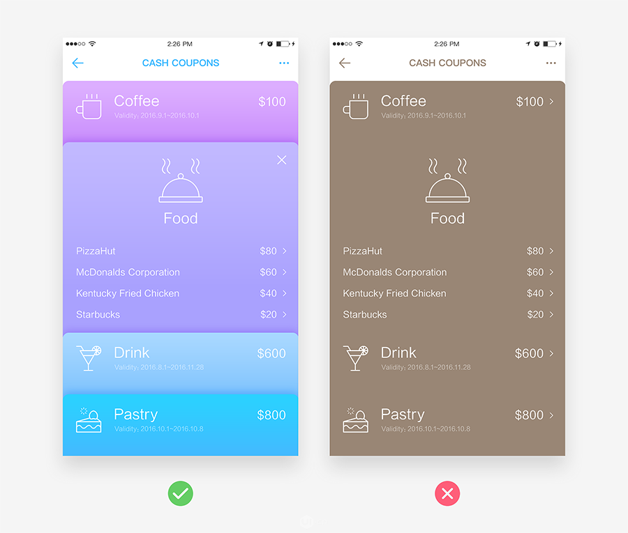 界面設(shè)計(jì)中往往細(xì)節(jié)的處理最容易被忽略,根據(jù)界面配色的不同,我們在分割線色彩的選擇上面也要做出相應(yīng)的調(diào)整。由于分割線的作用是區(qū)分上下信息層級和界面裝飾,配色的表現(xiàn)力要低于文字信息的力度,通常我們會選擇淺色而否定深色,這樣界面會更加簡潔通透。深色的分割線要慎用,除非在一些特定的產(chǎn)品場景下。