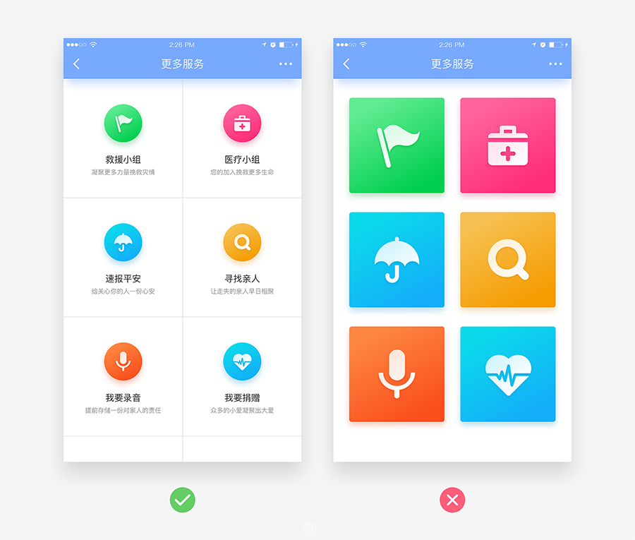 去掉圖標(biāo)文案之后界面會顯得更“逼格”,可是你確定用戶能看懂圖標(biāo)表達(dá)的含義嗎?我們在進(jìn)行界面設(shè)計(jì)時,圖標(biāo)是為了輔助說明文案所傳達(dá)的信息,如果去掉文案信息,那么需要圖標(biāo)本身帶有很強(qiáng)的信息傳達(dá)能力,確保用戶能正確的識別。