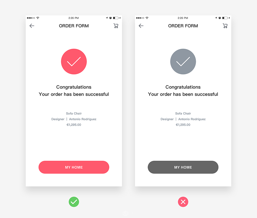 按鈕的設(shè)計(jì)必須要清晰準(zhǔn)確的傳達(dá)出當(dāng)前狀態(tài),不能為了視覺效果而帶給用戶錯誤的判斷,例如深灰色的按鈕用戶會理解為是禁用狀態(tài)而放棄點(diǎn)擊。