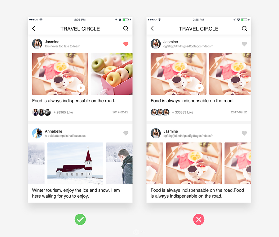 在進(jìn)行界面布局時,明確信息呈現(xiàn)的最大值,而不是取最小值進(jìn)行設(shè)計(jì)。過于理想的長度范圍也許界面樣式更美觀,可是落地之后就會給用戶帶來非常糟糕的體驗(yàn)。