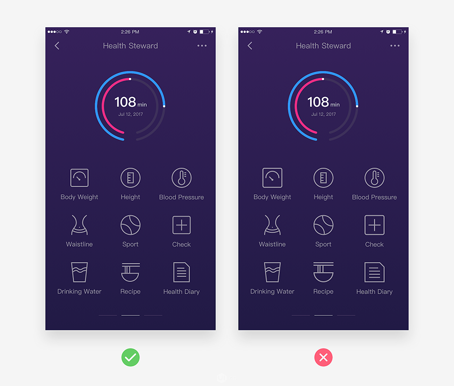 圖標(biāo)在配色上面也要保持有規(guī)律的統(tǒng)一,采用相同顏色是比較常用的配色方式。如果你采用不同色相的配色方式,要保持整體的配色協(xié)調(diào),不要出現(xiàn)飽和度、明度反差過大的配色而影響整體的視覺協(xié)調(diào)。