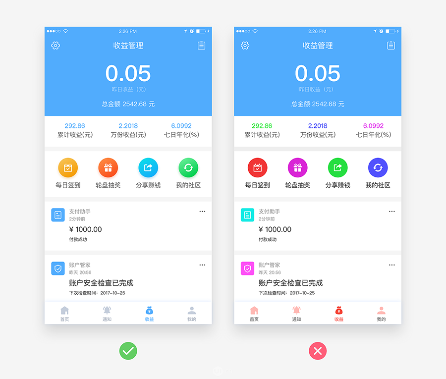 一個界面中出現(xiàn)3種左右的配色是相對比較容易把控的,如果超過3種以上的配色,是非??简?yàn)設(shè)計(jì)師功底的,如果顏色的處理不到位就會出現(xiàn)五彩斑斕的“視覺盛宴”。