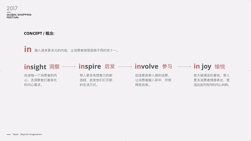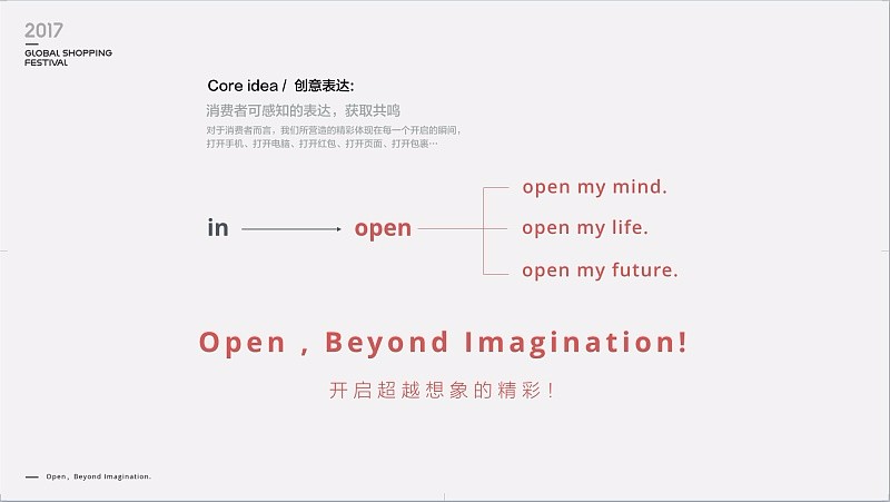 Open, Beyond Imagination! 開啟,超越想象的精彩!這就是我們表現(xiàn)上的靈感,用“open”來構建情感上的共鳴。歷史再一次證明,想不出來,是因為買的還不夠!靈感襲來,設計師興奮的一夜沒合眼…