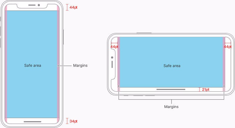 根據(jù)上述頂部傳感器、虛擬 home 鍵的不同要求,Apple 提供了橫、豎屏狀態(tài)下的安全區(qū)域視覺規(guī)范。