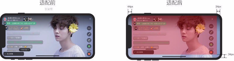 追求屏幕最大化的過程中,由于現(xiàn)階段工藝的問題,Apple 采用了一個(gè)高度 30pt 的黑色帶圓角條來放置揚(yáng)聲器、前置攝像頭及各種傳感器等,江湖人稱 「劉海兒」,這也意味著原頁(yè)面此處的內(nèi)容有可能會(huì)被遮擋導(dǎo)致顯示欠佳,進(jìn)而影響用戶體驗(yàn),所以此處也是我們適配過程中的一個(gè)關(guān)注點(diǎn)。