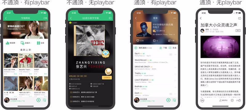 而 QQ 音樂移動(dòng)終端內(nèi)的適配主要分為了不通頂 。 有 playbar、不通頂 · 無 playbar、通頂 · 有 playbar、通頂 · 無 playbar 四種場(chǎng)景。