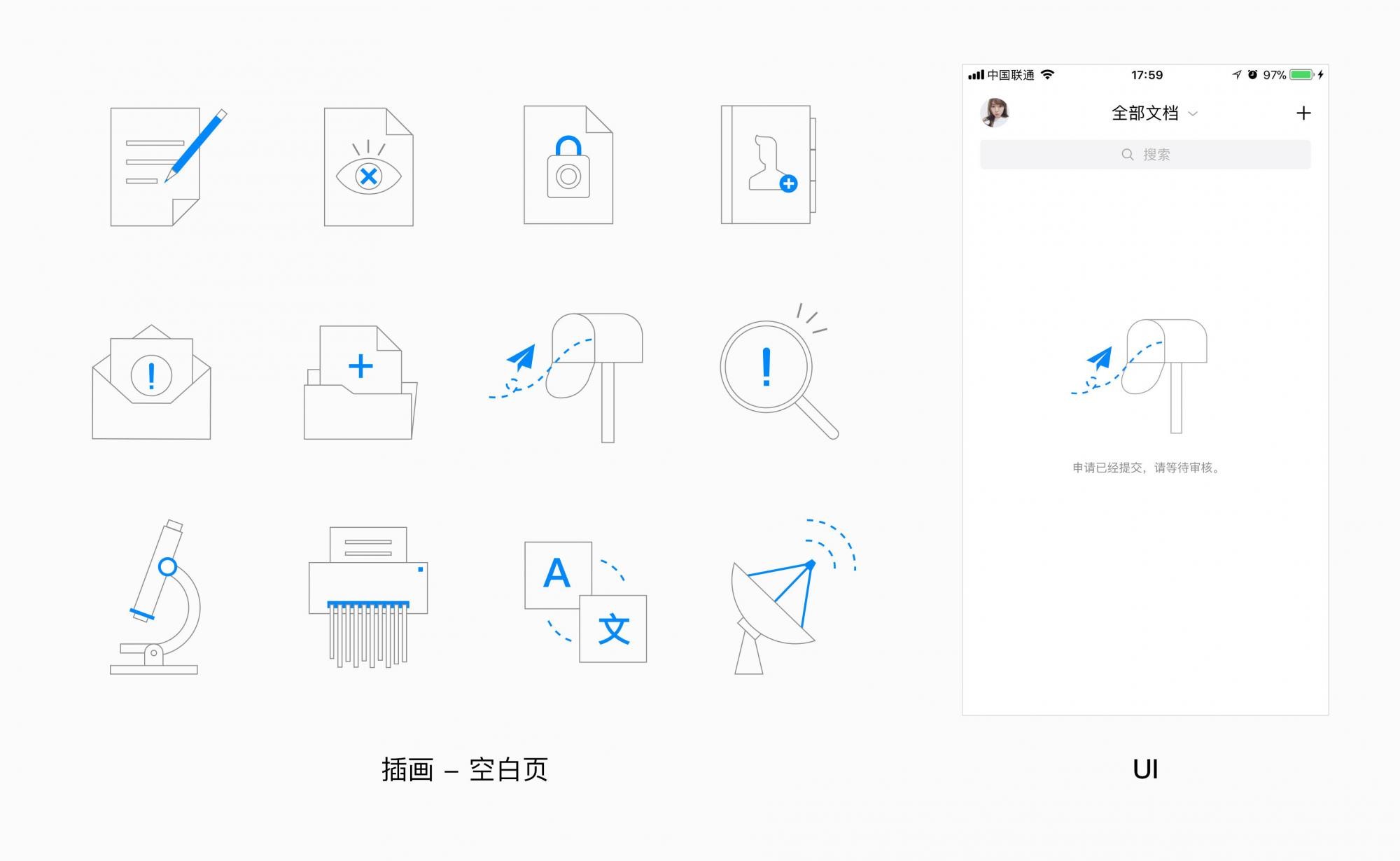 空白頁是暗示用戶缺失的場景,因此圖形呈現(xiàn)不能太強眼。整體使用灰色描邊,強調(diào)內(nèi)容使用品牌藍(lán)點綴。藍(lán)色在灰色線條中帶來新鮮感,也強調(diào)品牌感。