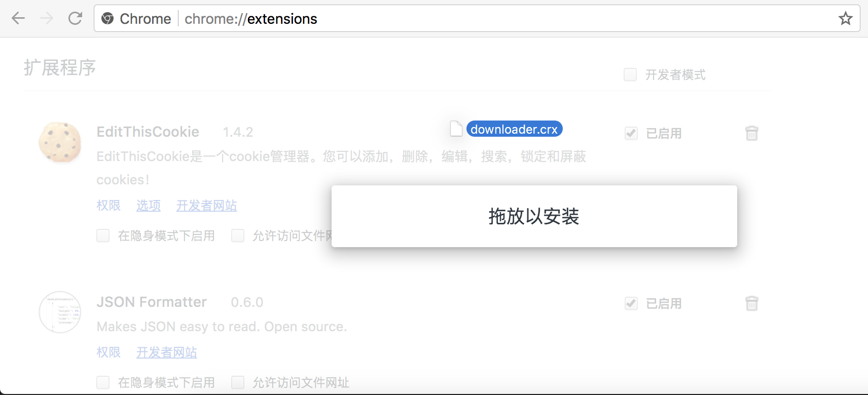 把下載好的“新版谷歌瀏覽器插件.crx”從文件夾里直接拖到“擴(kuò)展程序”界面中。