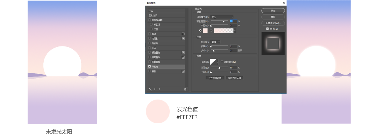 5繪制陽光在AI中繪制了一個陽光,拖拽到PS中,陽光填充顏色:#fffff 陽光在PS中顯得比較突兀,和整體不融合,這樣就需要給圓做一個外發(fā)光。選中陽光圖層右鍵-混合選項-外發(fā)光,混合模式:濾色、不透明度75%、圖素大小:27,方法:柔和,顏色:#ffe7e3