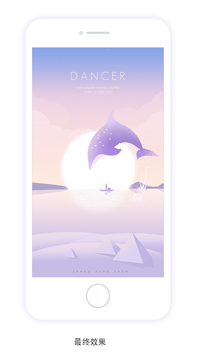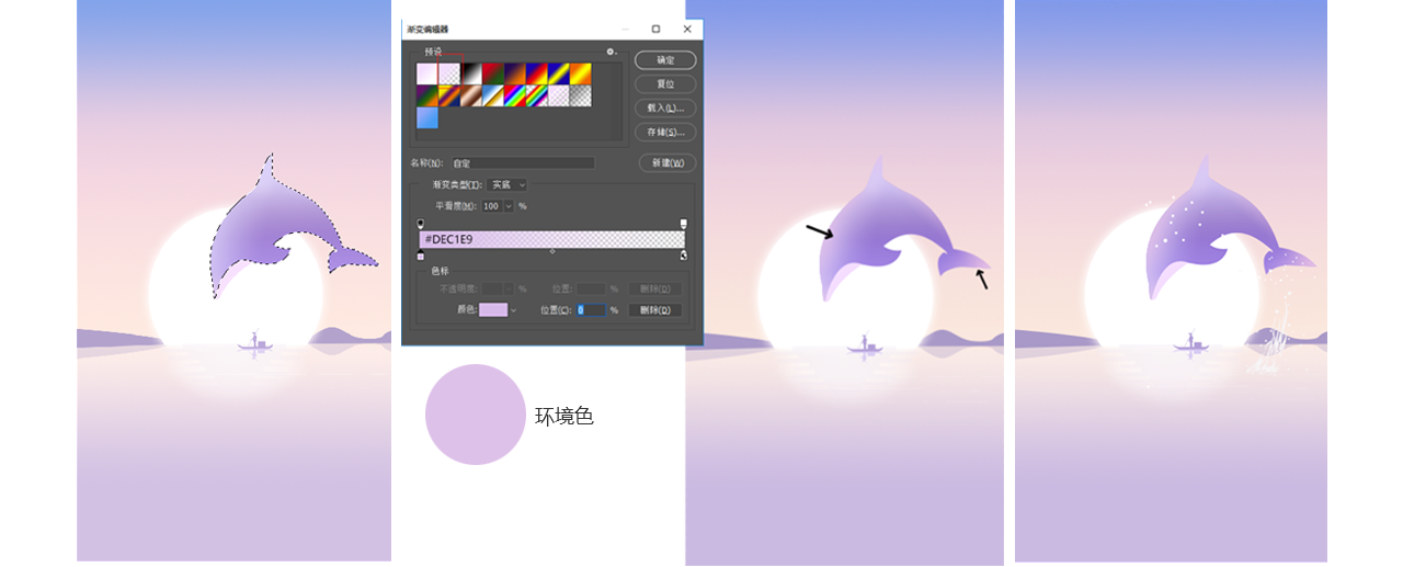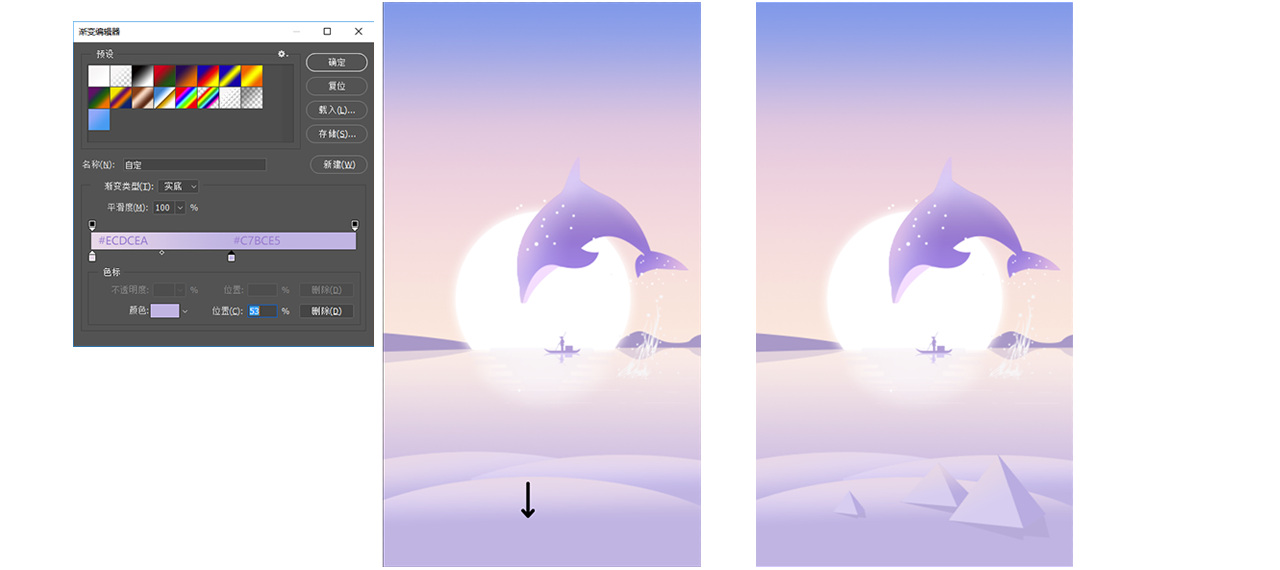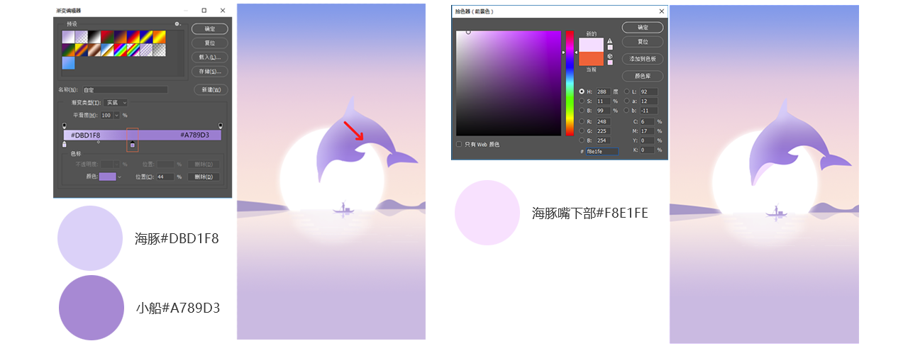 把海豚放在相應(yīng)的位置,放在太陽正上方有一些太居中,往右移動幾像素從視角上來說生動了不少。然后給海豚一個漸變的色值,從左上方拉到右下方、色值為:#dbd1f8 #a789d3 要注意的是#a789d3給的多一些、因為這個是主色調(diào)。然后把海豚的第二部分嘴下半部元素組合給一個色值:#f8e1fe