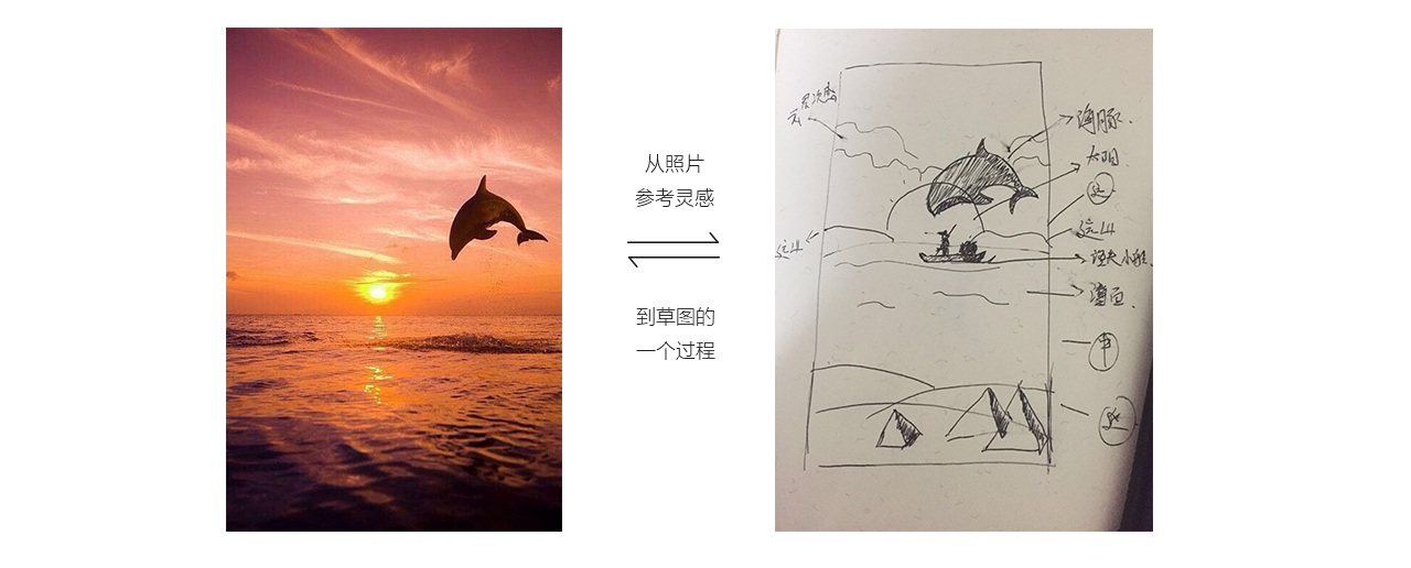 根據(jù)草圖,收集一些元素圖片,目的是知道海豚、漁船、陽光是什么樣的。根據(jù)圖片創(chuàng)意加工造型變化,變成自己所需要的素材。收集一些云彩、遠(yuǎn)處的山、漁夫小船、海豚、陽光等相關(guān)素材。