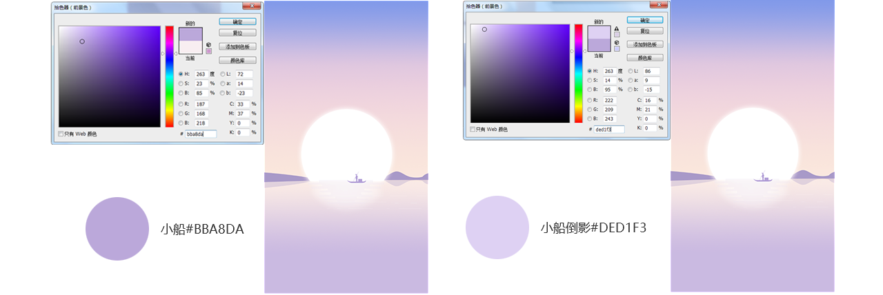 9.湖面也處理差不多了、那么給整個畫面增加一些輔助氣氛、在AI中畫的小船漁夫?qū)氲疆嬅嬷?,擺放好位置,給小船一個顏色#bba8da,這樣小船感覺像在空中飄著,緊接著給小船一個陰影讓小船有一個厚重感是在海面上飄著的。復(fù)制一層小船,然后旋轉(zhuǎn)把小船壓扁一些感覺像個倒影、給小船陰影一個顏色#ded1f3。