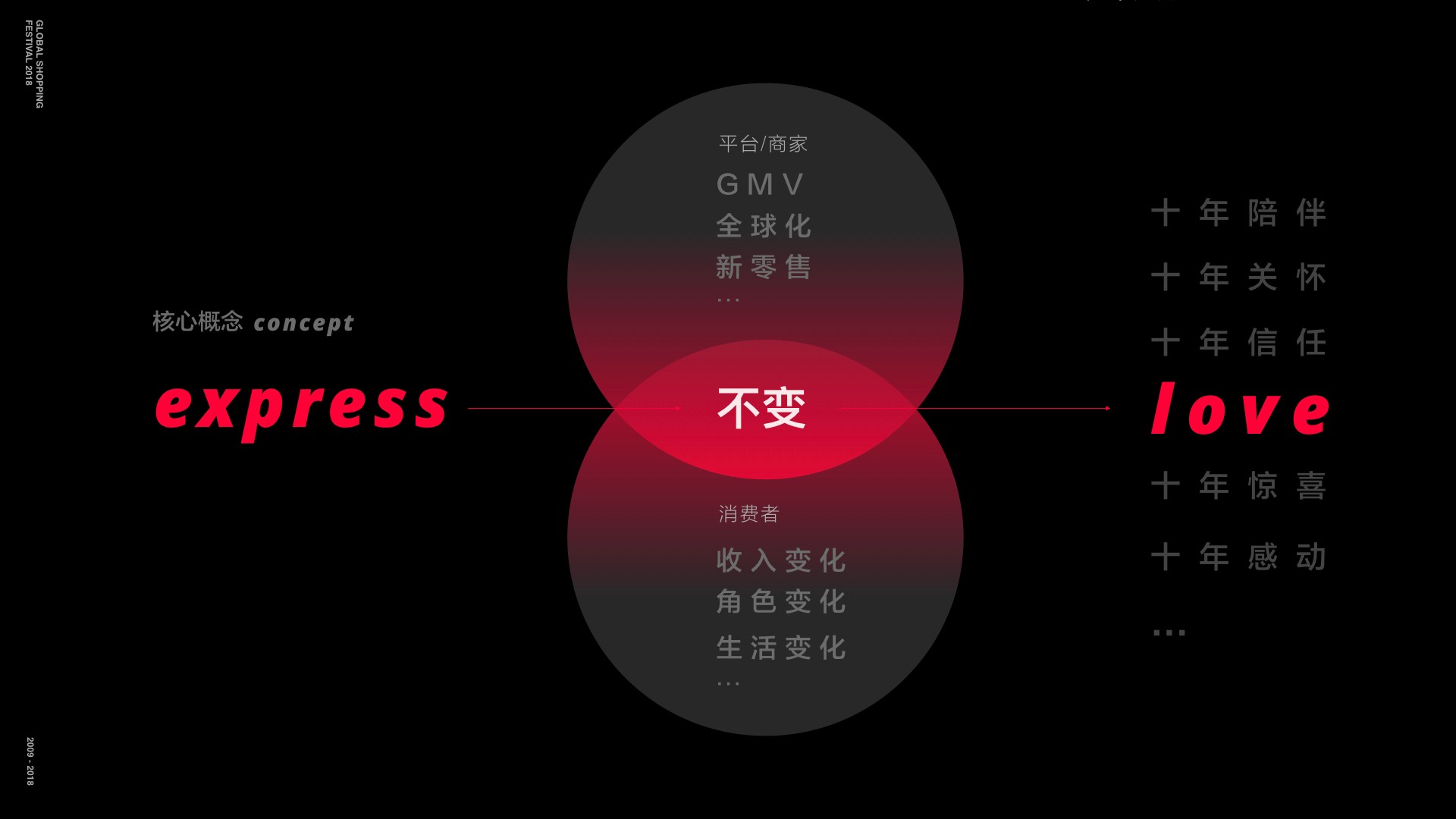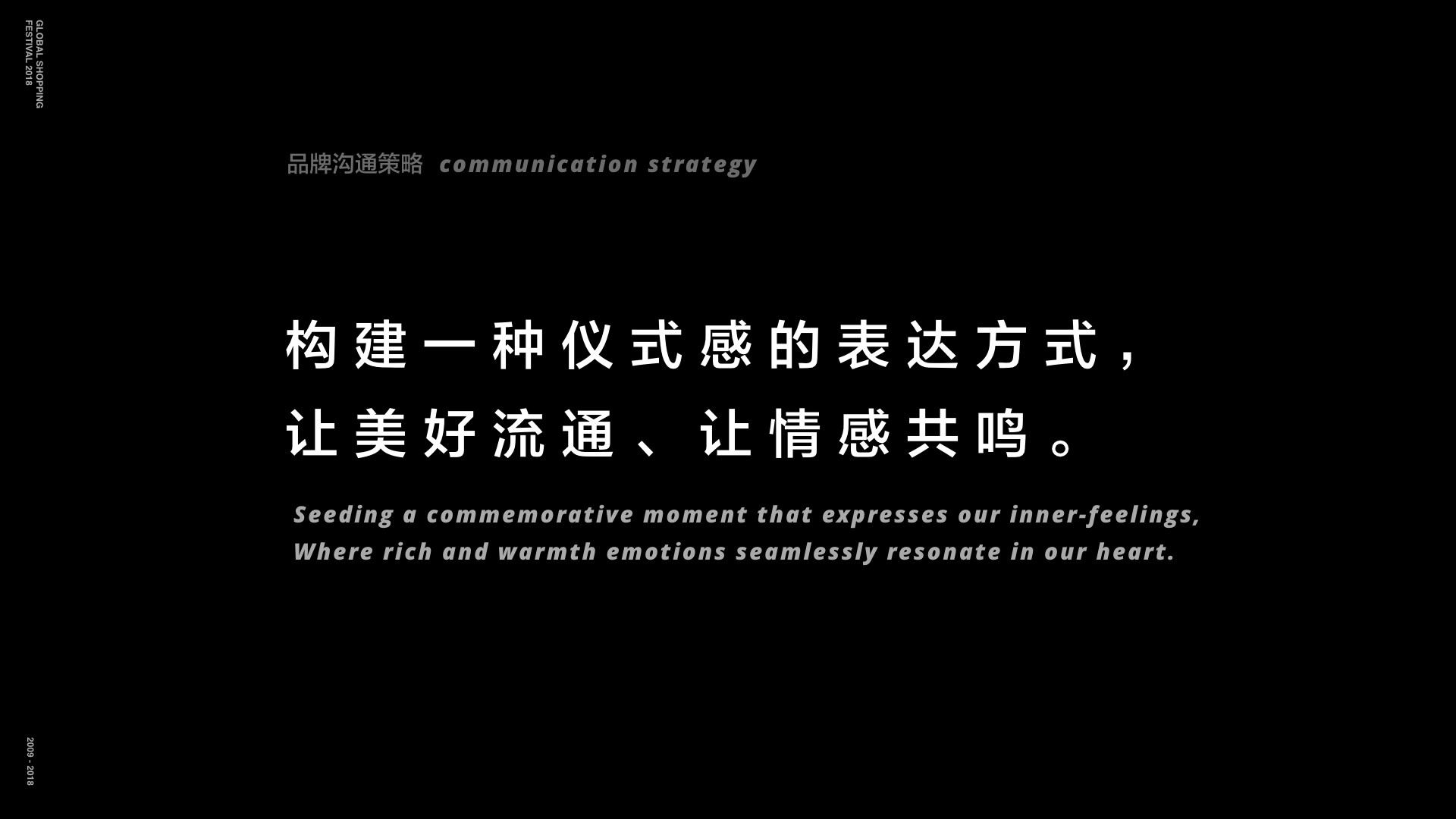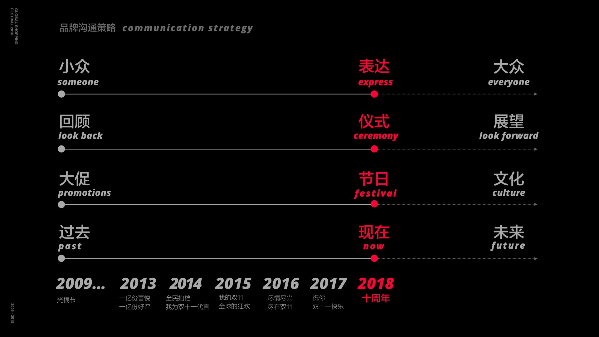 從2009到2018,歷經(jīng)十年的演變,天貓雙11早已不是當年的規(guī)模,它所服務的用戶遍布全球,這里面內涵和外延都發(fā)生了巨大的改變。這十年當中,天貓雙11從主打“五折”到“不止五折”再在到“祝你雙十一快樂”,溝通的重點早已不是大促這么簡單,而是開始溝通節(jié)日心智,引領全球消費者通過雙11這個節(jié)日,發(fā)現(xiàn)快樂,開啟理想生活。面向未來,我們還需要把節(jié)日演變成一種文化,文化就需要有內涵,我們如何賦予雙十一更深層的文化內涵,讓節(jié)日心智在消費者腦海中沉淀升華,是我們需要溝通的重點。