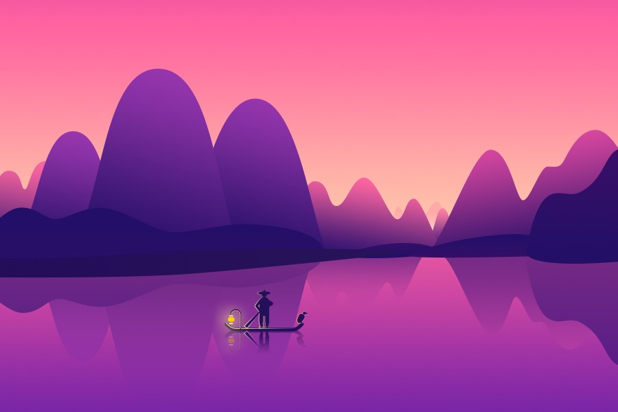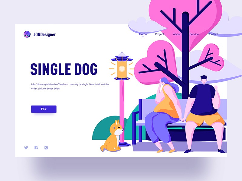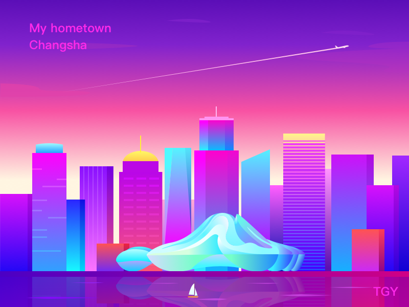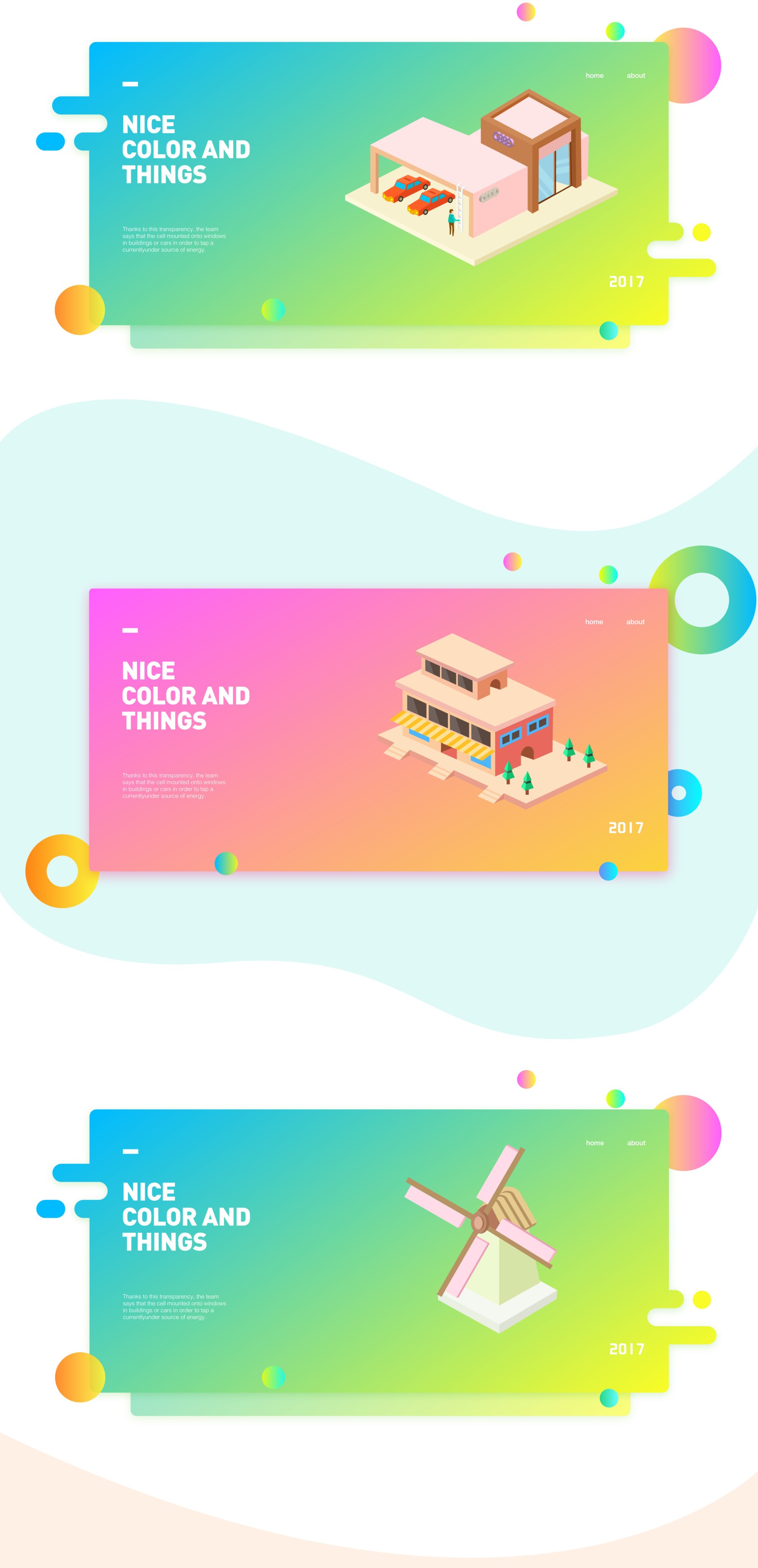 即通過色輪上兩個(gè)相連的顏色所創(chuàng)建的漸變,這類顏色過渡比較緩和,所以給人的視覺感受很舒服、很美好。類比漸變色相對(duì)純顏色可以表現(xiàn)出更豐富的效果,而與前面提到的冷暖漸變色相比則又略微低調(diào)一點(diǎn),很適合用于風(fēng)景插畫、Ui設(shè)計(jì)和網(wǎng)頁設(shè)計(jì)中。