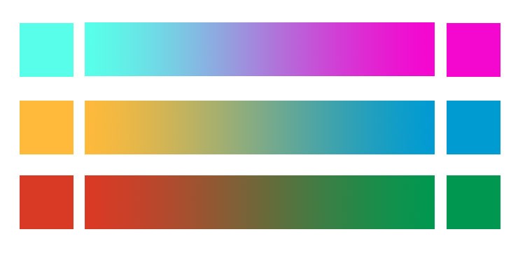 注意事項(xiàng):在軟件中創(chuàng)建此類漸變色時(shí),只吸取首尾端的兩個(gè)顏色來拉漸變,出來的效果會(huì)比較溫和,中間的色調(diào)會(huì)偏灰;如果想要更鮮艷的效果,可以在色條中間增加一兩個(gè)過渡色,例如在青色到玫紅色的漸變中可以增加藍(lán)色和紫色,前后兩個(gè)效果有很大差別,你可以根據(jù)自己的需求進(jìn)行選擇。