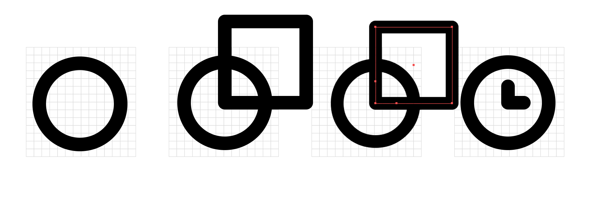 如果我們想設(shè)計一個小圖標(biāo),那么我們可以把畫布放大到400%來設(shè)計。同時可以使用網(wǎng)格和參考線來作為我們設(shè)計的輔助。網(wǎng)格在很多軟件里都有,比如在Illustrator中點擊視圖 > 網(wǎng)格 即可開啟網(wǎng)格了。參考線模板則需要下載第三方設(shè)計的模板,比如Material Design的參考線模板就有正方形、圓形、圓形和長方形結(jié)合等不同形式。如果對齊模板中的形狀,即可得到面積相等的長方形、正方形、圓形。這對我們構(gòu)建視覺上面積相等的圖標(biāo)很有益處。