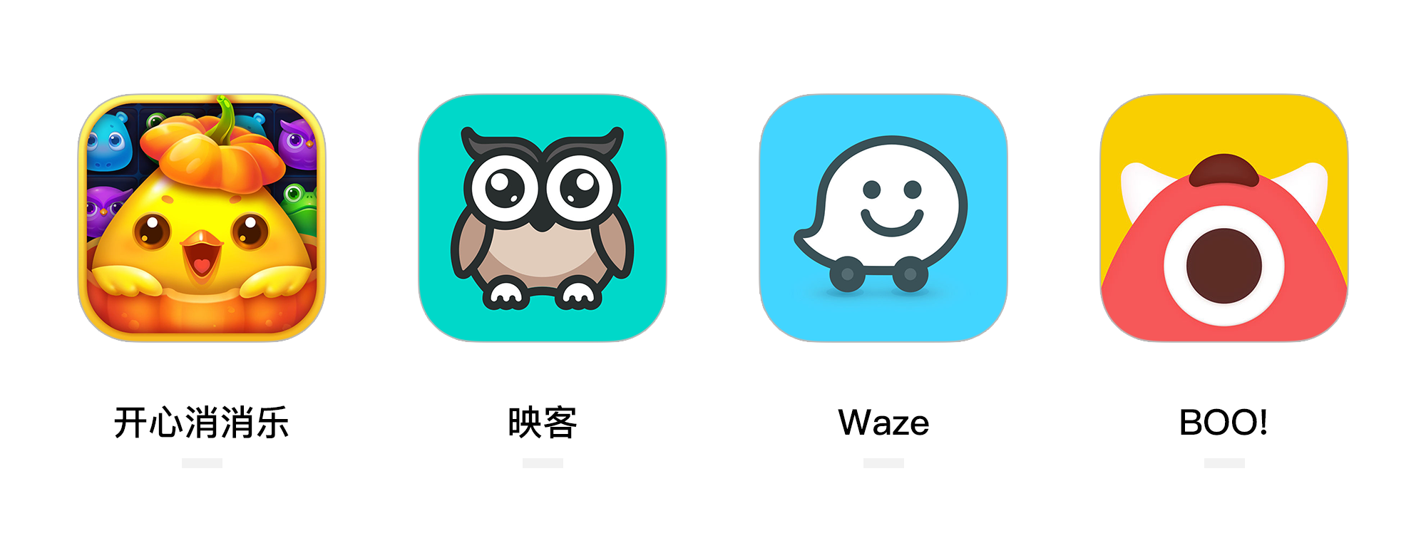 開心消消樂、映客、Waze、BOO!的產(chǎn)品圖標(biāo)
