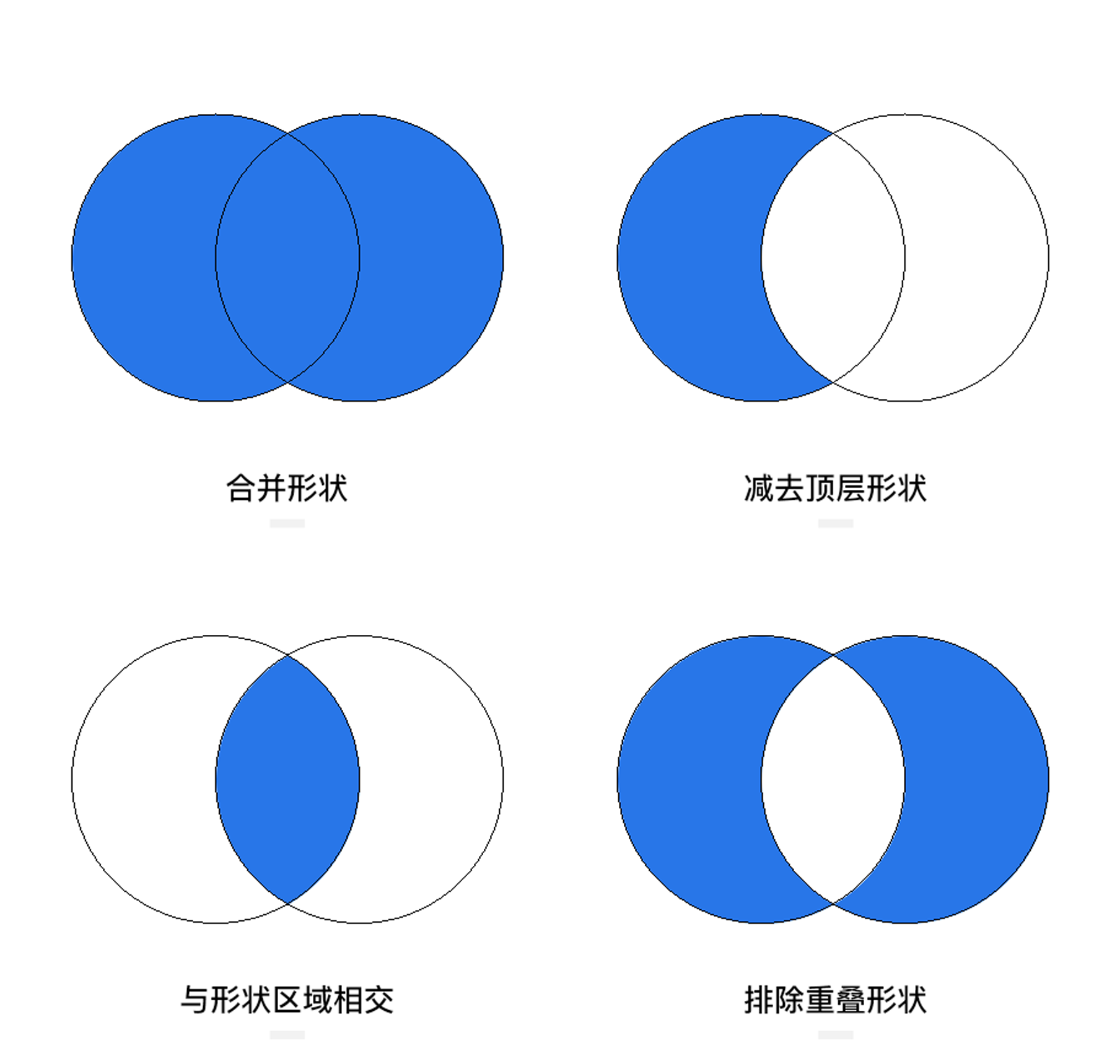 布爾運算的核心就是兩個形狀的關(guān)系:即Union(并集)、Intersection(交集)和Subtraction(差集,包括A-B和B-A兩種)。這些關(guān)系有點像我們初中學(xué)過的數(shù)學(xué),應(yīng)該比較好理解。但是很多軟件中對于布爾運算的關(guān)系翻譯不同,所以可能大家會有些不適應(yīng)。比如在Photoshop中布爾運算被翻譯成:合并形狀、減去頂層形狀、與形狀區(qū)域相交、排除重疊形狀。而在Adobe XD中則翻譯成:添加、減去、交叉、排除重疊。雖然名字不同,但是功能是相同的,所以大家在學(xué)習(xí)新的軟件時不妨先找一下布爾運算。