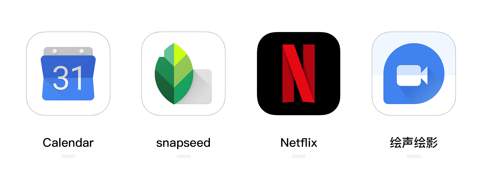 Calendar、Snapseed、Netflix、繪聲繪影的產(chǎn)品圖標(biāo)