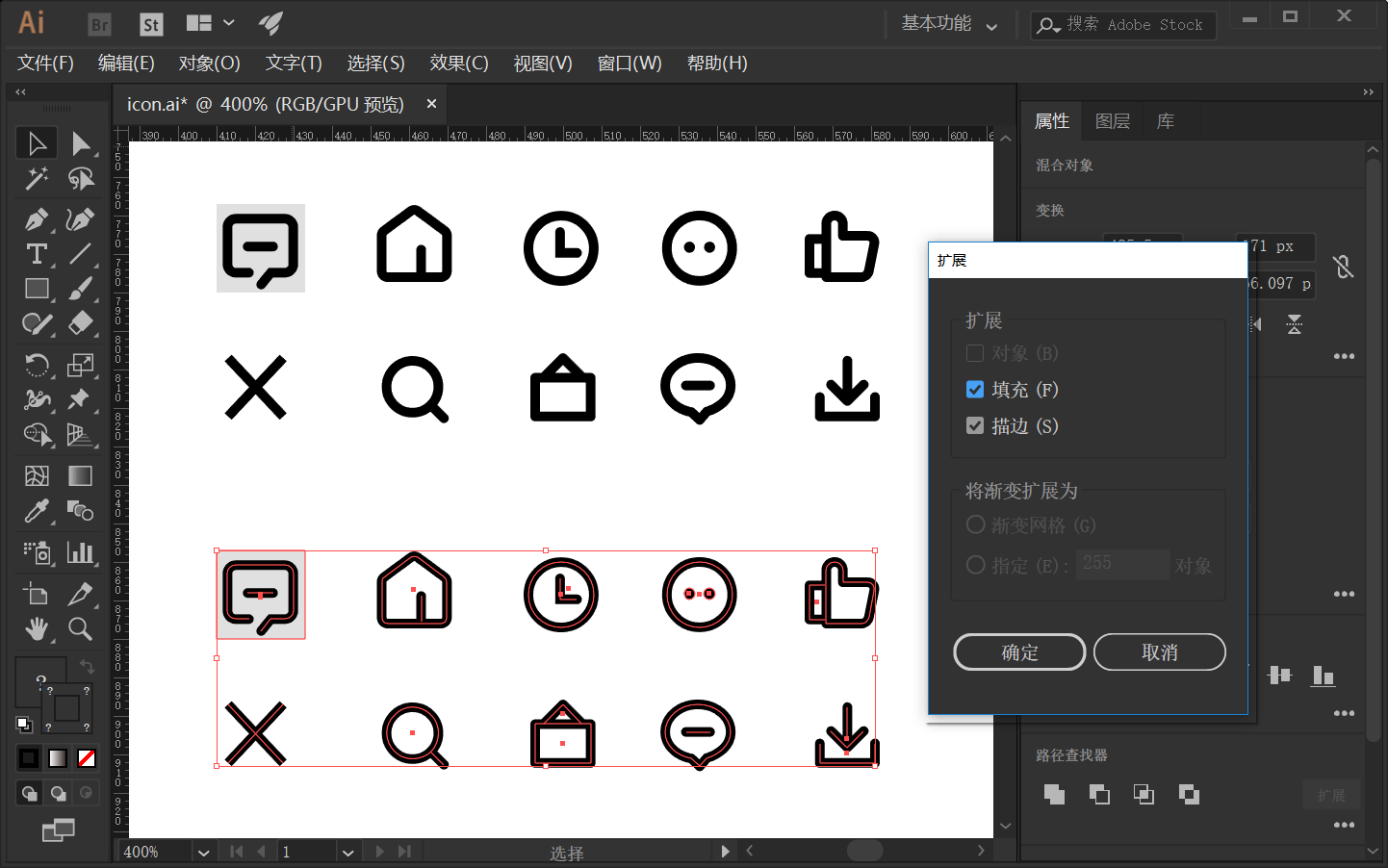 如果您掌握了以上填充態(tài)圖標(biāo)的設(shè)計方法,相信其他圖標(biāo)的設(shè)計只要以此及彼的思考,就可以完成。比如線性圖標(biāo),在繪制線性圖標(biāo)時,我們首先會建立一個半透明的矩形來固定圖標(biāo)應(yīng)該繪制的范圍,比如“40px”。然后我們把填充關(guān)閉,只使用描邊來繪制線性圖標(biāo)即可。繪制完以后我們無需保存文件,僅通過Ctrl+C的復(fù)制快捷鍵,然后打開Sketch或者Adobe XD就可以使用Ctrl+V將圖標(biāo)粘貼過去了。但是,如果您使用Photoshop做界面設(shè)計,可能會多兩道手續(xù),首先就是線性圖標(biāo)需要擴展才可以復(fù)制到Photoshop中。將圖標(biāo)復(fù)制一份(擴展之后的圖標(biāo)不方便修改,所以要留著可修改版本),然后點擊對象菜單 > 擴展,點確定,就可以把原本是沒有閉合的路徑改為完整的形狀。