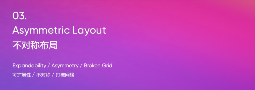 與過去基于固定網格系統(tǒng)的布局相比,最近越來越趨于使用僅顯示圖像一部分的非對稱布局。雖然好像只顯示整個圖像的一部分,設計師卻可以在大系統(tǒng)中無限延展每個圖形。你可以認為平衡被打破了,設計師卻可以更加自由地應用圖形元素,呈現(xiàn)更強烈的視覺印象,還可以有很酷的圖形組成。