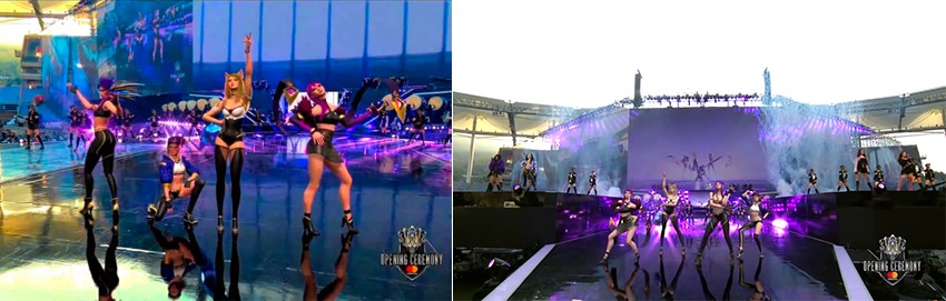 2018年英雄聯(lián)盟的開幕舞臺利用AR技術,使演唱POP / Stars的真人歌手和游戲里K / DA角色一起同臺演出。這些被實時跟蹤的角色,在實際舞臺上帶來了真實的表演效果。
