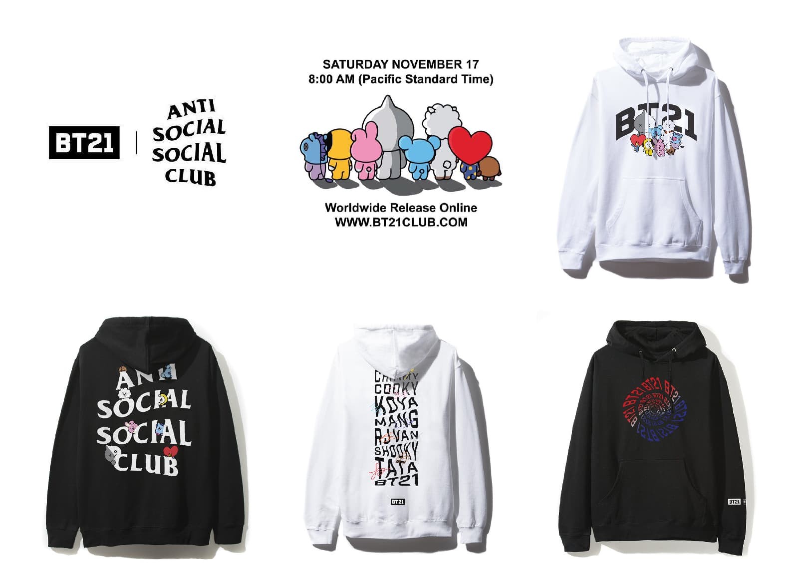 Anti Socal Social Club曾經(jīng)將他們靈活的logo應(yīng)用在各式短語或品牌名稱中。這次聯(lián)名,他們把標(biāo)志性的logo與BT21的角色,品牌名稱還有缺乏萌性、略顯笨拙的logo相融合,很好地協(xié)調(diào)了ASSC獨(dú)特的品牌風(fēng)格。