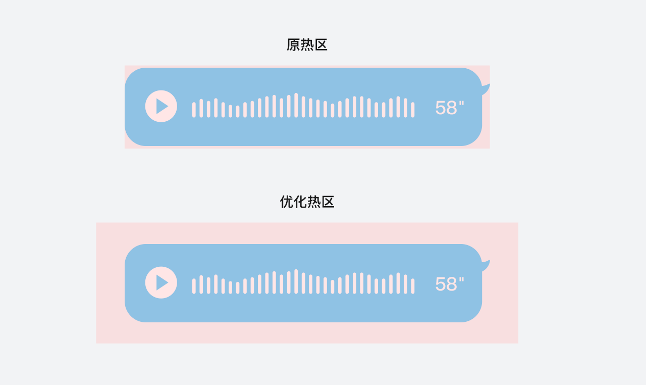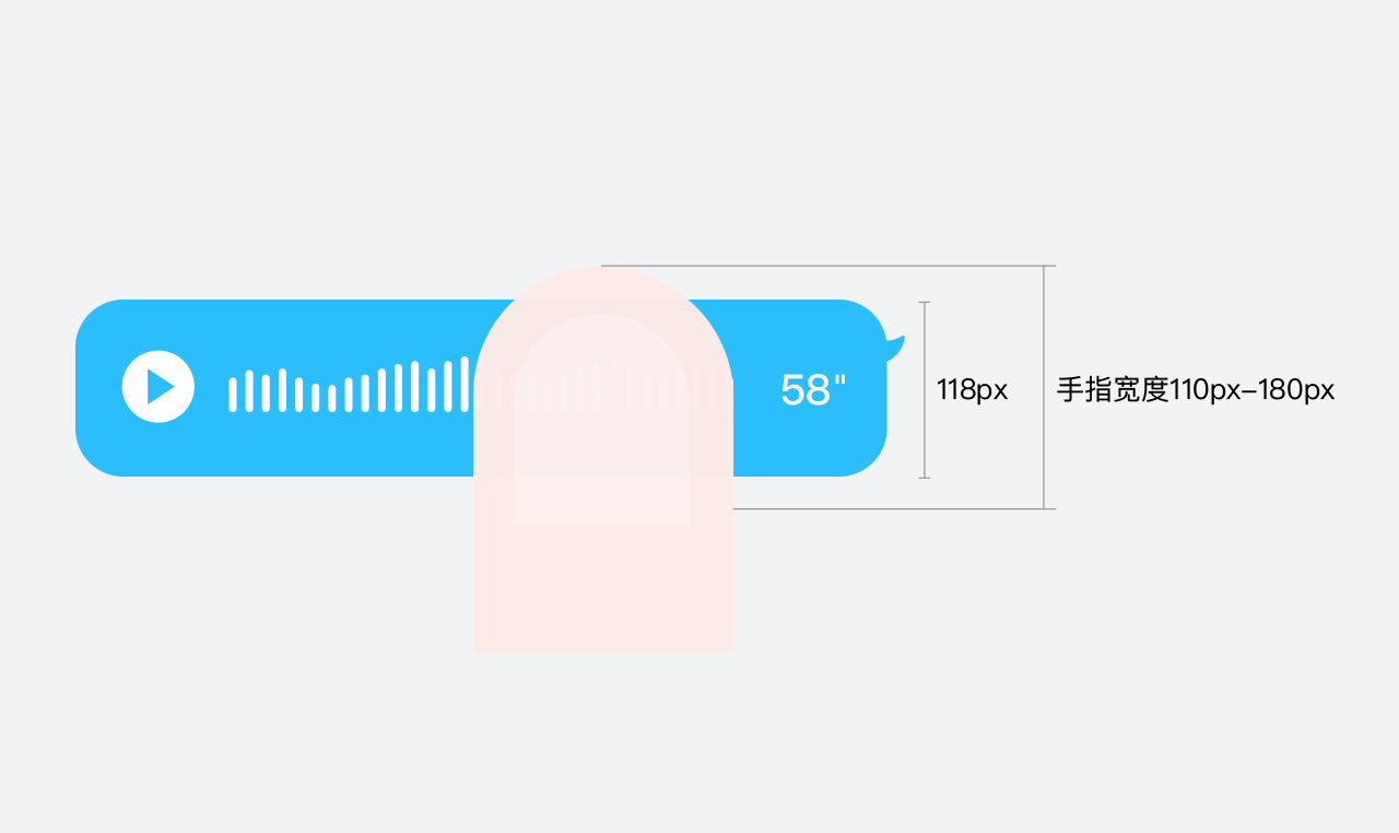 暢快意味著無拘無束,翻譯成交互語言就是要賦予用戶更大的操作區(qū)域。但是我們的手指寬度和控件大小有時難以匹配。例如,8.0UI改版后的語音氣泡高度為118px,而成人手指的寬度范圍則在110px-180px。如果拖拽只能在氣泡范圍內(nèi)進(jìn)行,就意味著用戶需小心翼翼地去操作。為了實現(xiàn)“無拘無束”的拖拽體驗,我們根據(jù)用戶的行為階段對響應(yīng)范圍進(jìn)行了兩次放大。