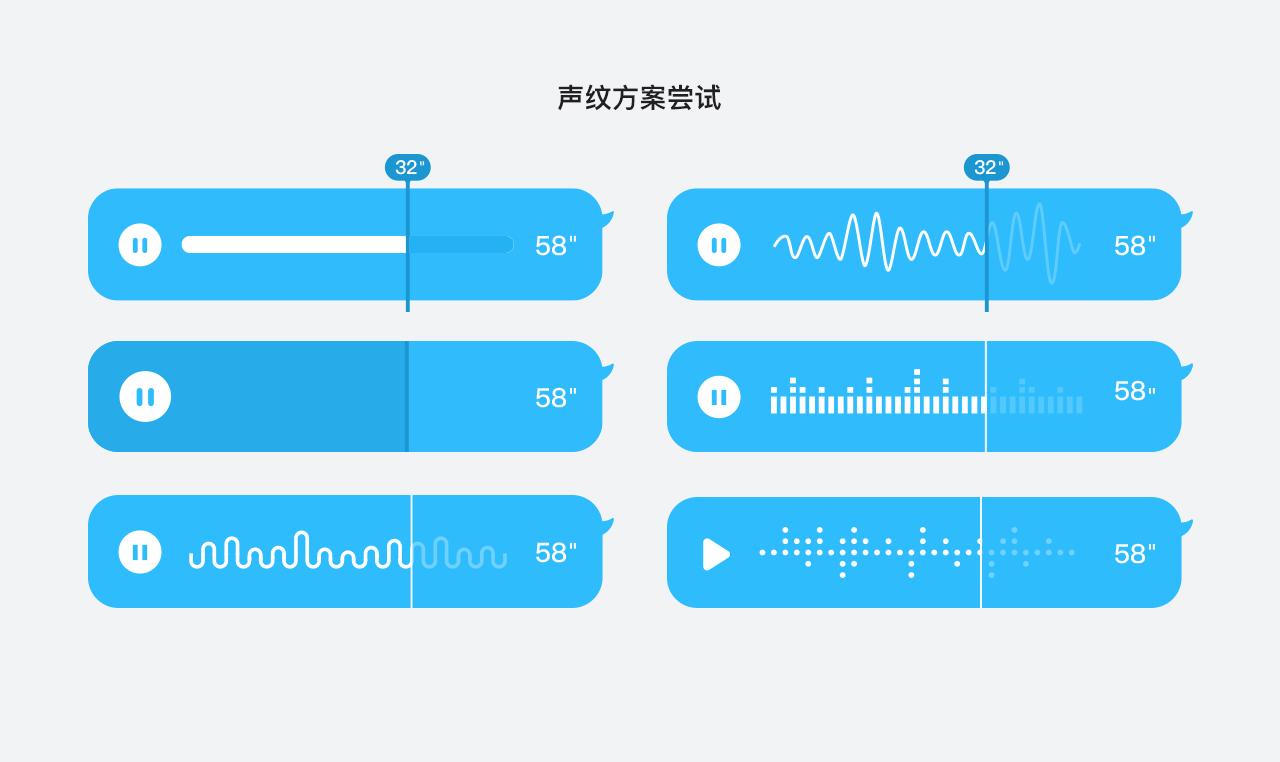 但是這些元素的加入無疑會加重氣泡內(nèi)的信息負(fù)擔(dān)。并且當(dāng)同時出現(xiàn)多個語音氣泡時,我們更加需要保證聊天頁面有適當(dāng)?shù)男畔⒚芏取R虼嗽诼暭y樣式設(shè)計中,降噪成為了關(guān)鍵。在發(fā)散了多種樣式后,我們最終選擇了這種簡約的聲紋形態(tài)。它既能很好的展示進(jìn)度信息,又可以平衡氣泡內(nèi)的信息密度,讓QQ多樣化的用戶群都能對語音進(jìn)度拖拽有更直覺化的操作。