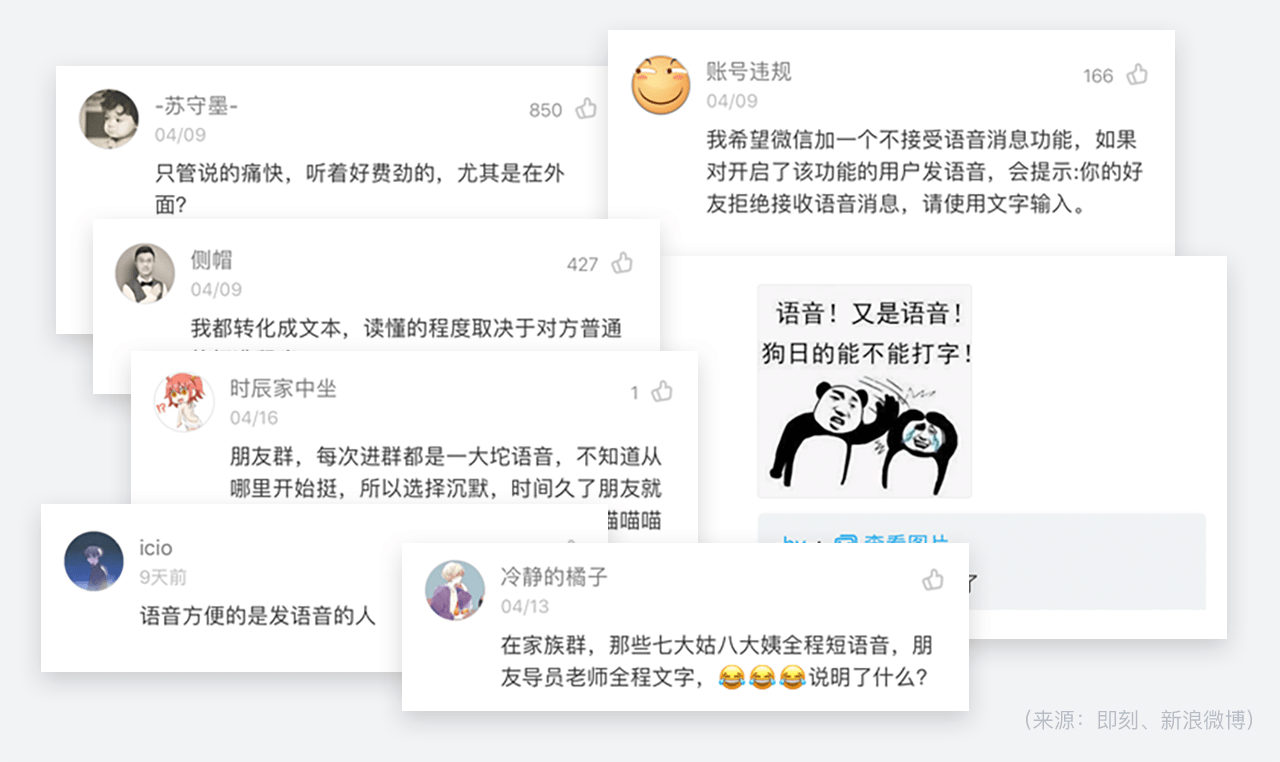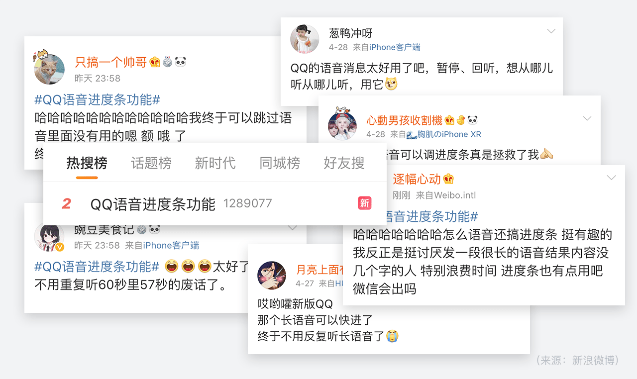 QQ新版語音氣泡iOS上線當(dāng)天喜提微博熱搜。看到用戶們的花式夸獎,我們的心情美滋滋。但同時網(wǎng)絡(luò)上也出現(xiàn)了一些負(fù)面的評價,這些聲音也在鞭策設(shè)計團(tuán)隊持續(xù)打磨語音消息體驗。