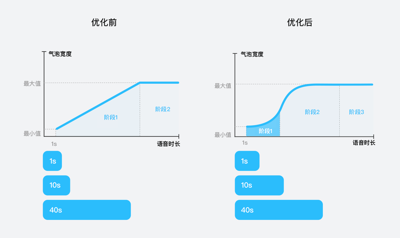 [階段1] 斜率逐漸增加的曲線。此階段對應(yīng)著短時長語音,也是用戶的高頻使用場景。因此該階段氣泡長度隨語音時長的增長需要更加明顯;[階段2] 斜率逐漸減小的曲線。此階段對應(yīng)的長語音是低頻場景,此時氣泡長度隨語音時長變化的反饋可以適當(dāng)放緩;[階段3] 達(dá)到氣泡長度最大值,不再變化。此時為超長語音階段,用戶已經(jīng)不需要通過氣泡長度來判斷語音時長。